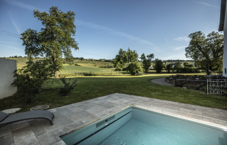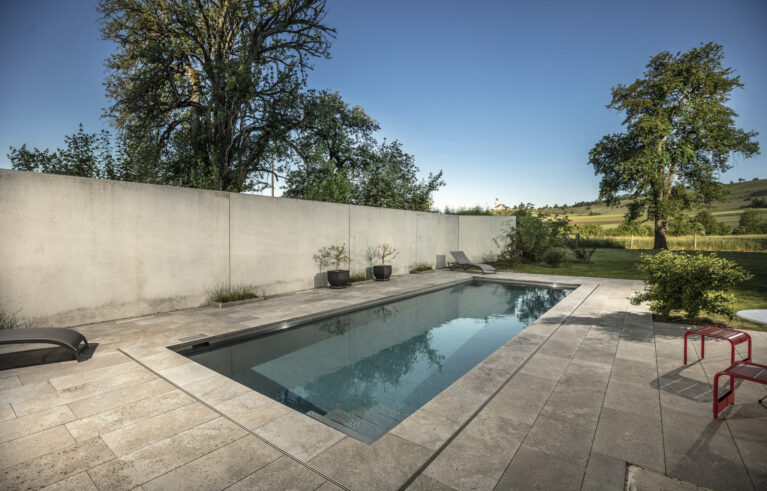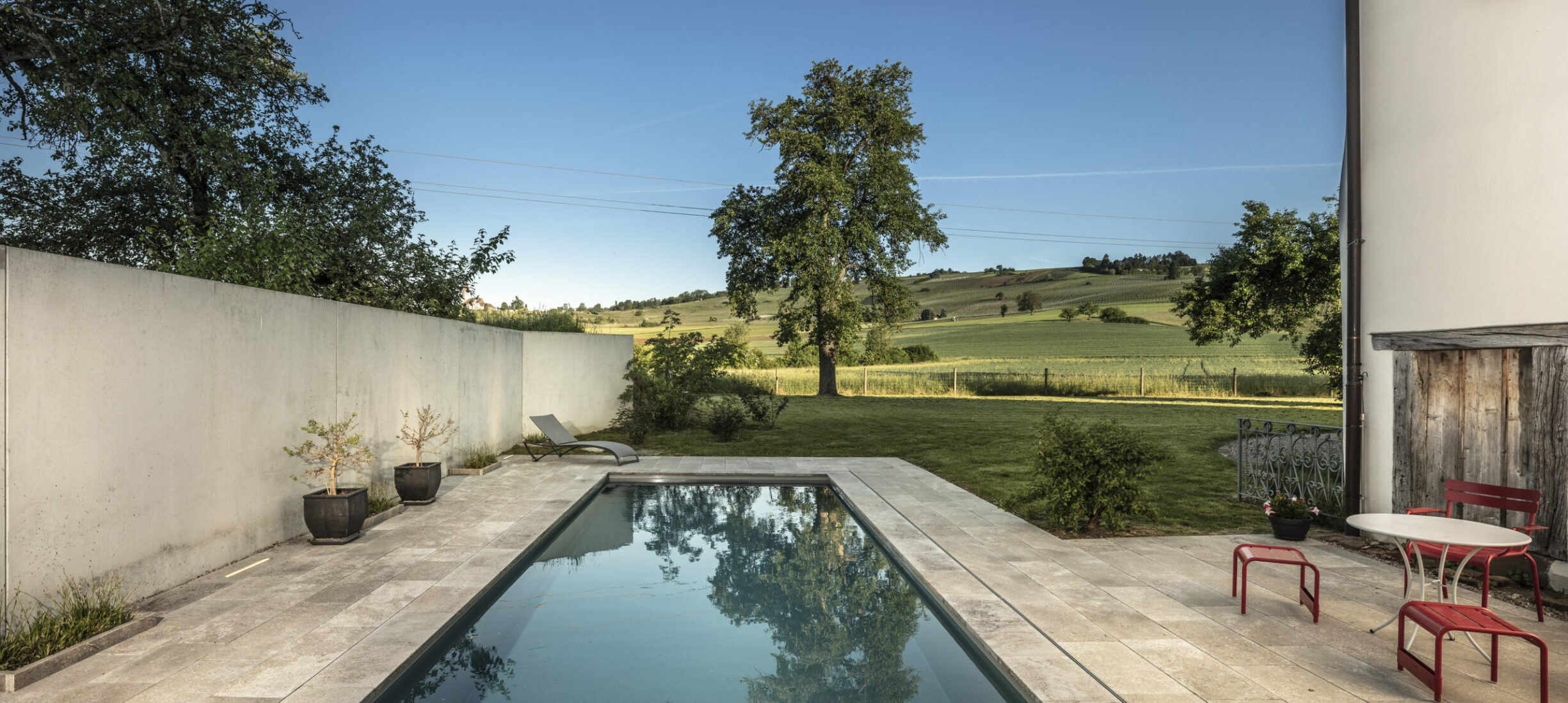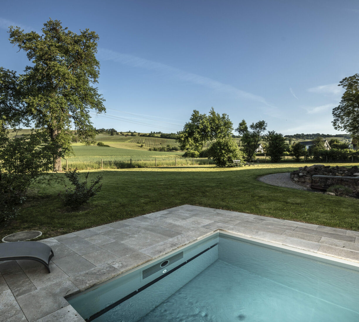 Früher war das Wasser dazu da, die Mühle zu betreiben. Heute sorgt es für Abkühlung an heissen Tagen. Die 1608 erbaute alte Mühle befindet sich heute in Privatbesitz. Die Pool Anlage ist modern, harmoniert aber trotzdem perfekt mit dem renovierten und antiken Stil der Mühle. Die Gartenplatten aus Kuaker Kalkstein sind neu und verleihen dem Pool einen rustikal-modernen Touch.
