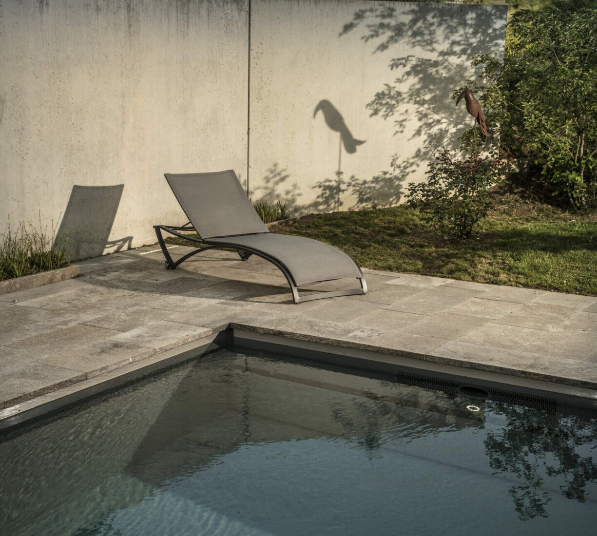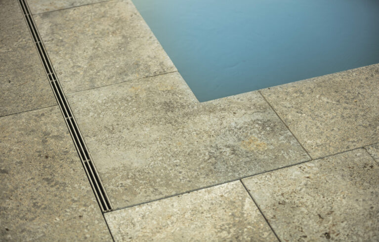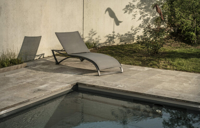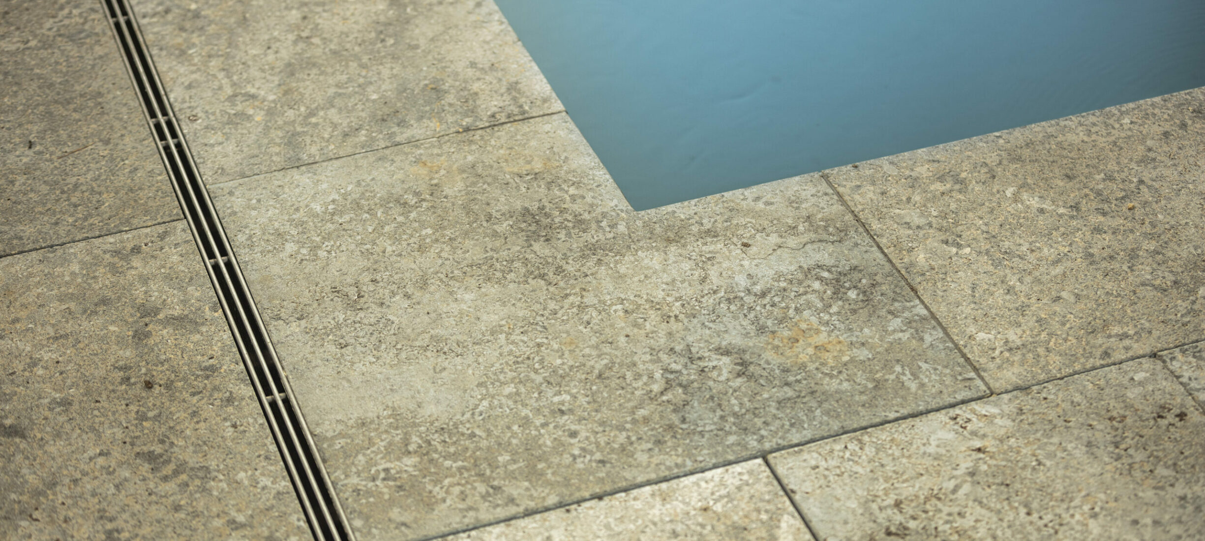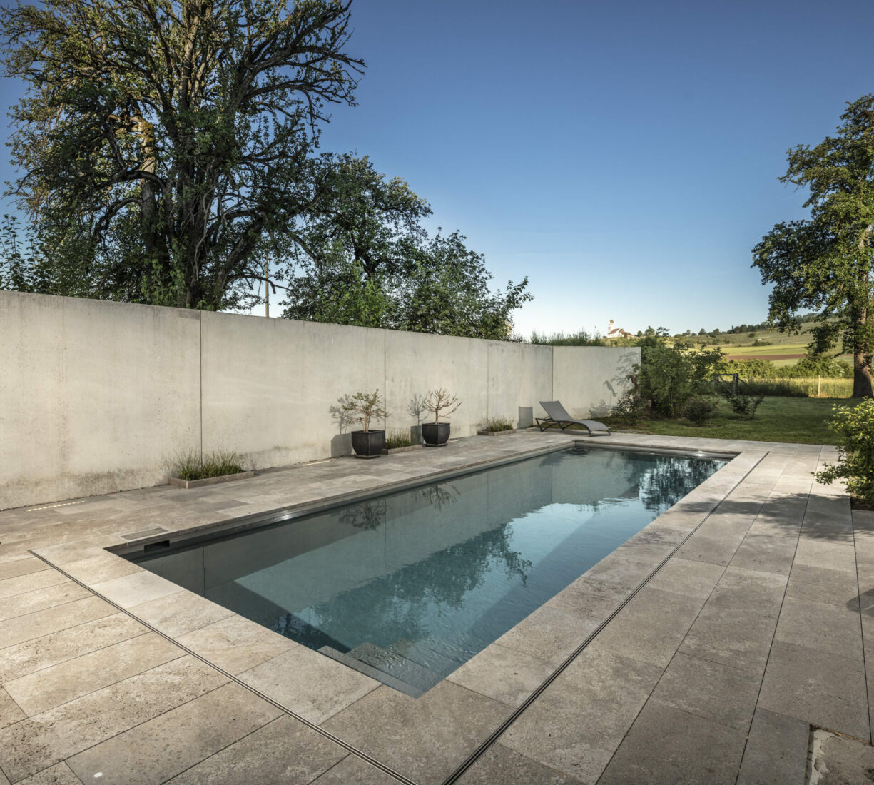 Früher war das Wasser dazu da, die Mühle zu betreiben. Heute sorgt es für Abkühlung an heissen Tagen. Die 1608 erbaute alte Mühle befindet sich heute in Privatbesitz. Die Pool Anlage ist modern, harmoniert aber trotzdem perfekt mit dem renovierten und antiken Stil der Mühle. Die Gartenplatten aus Kuaker Kalkstein sind neu und verleihen dem Pool einen rustikal-modernen Touch.