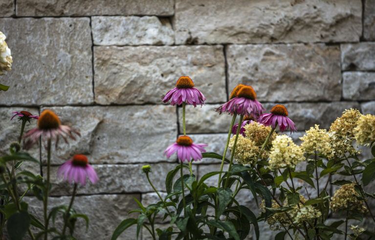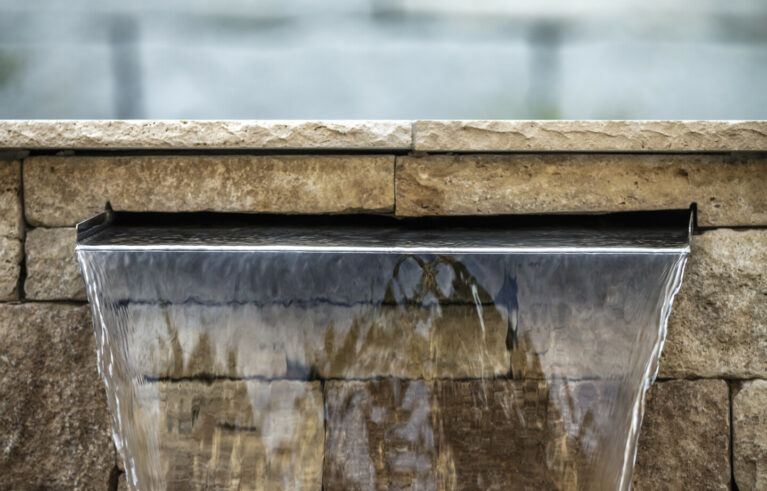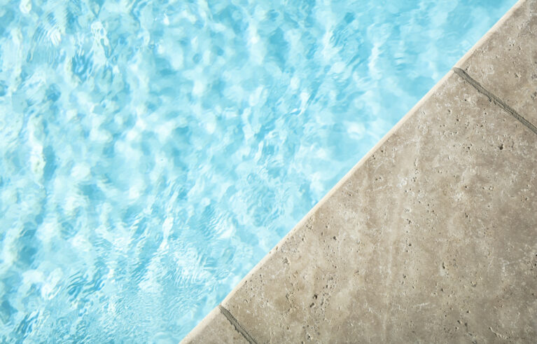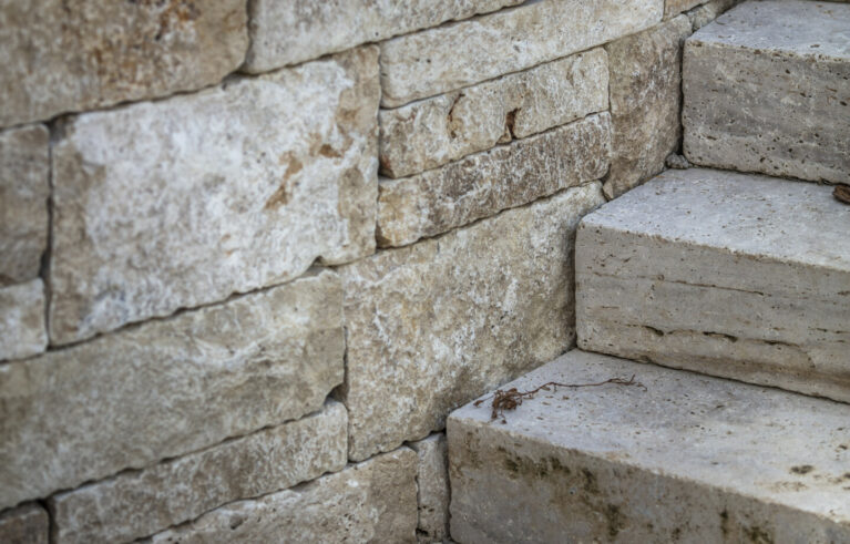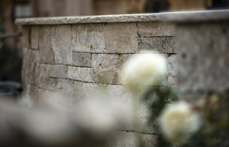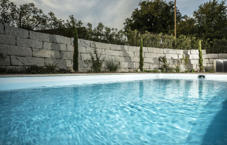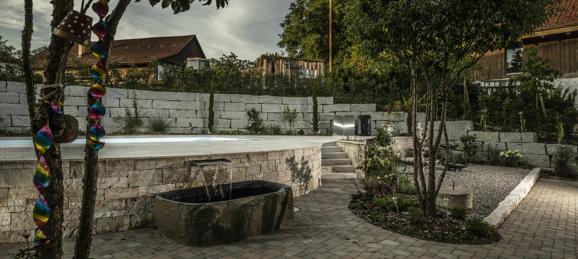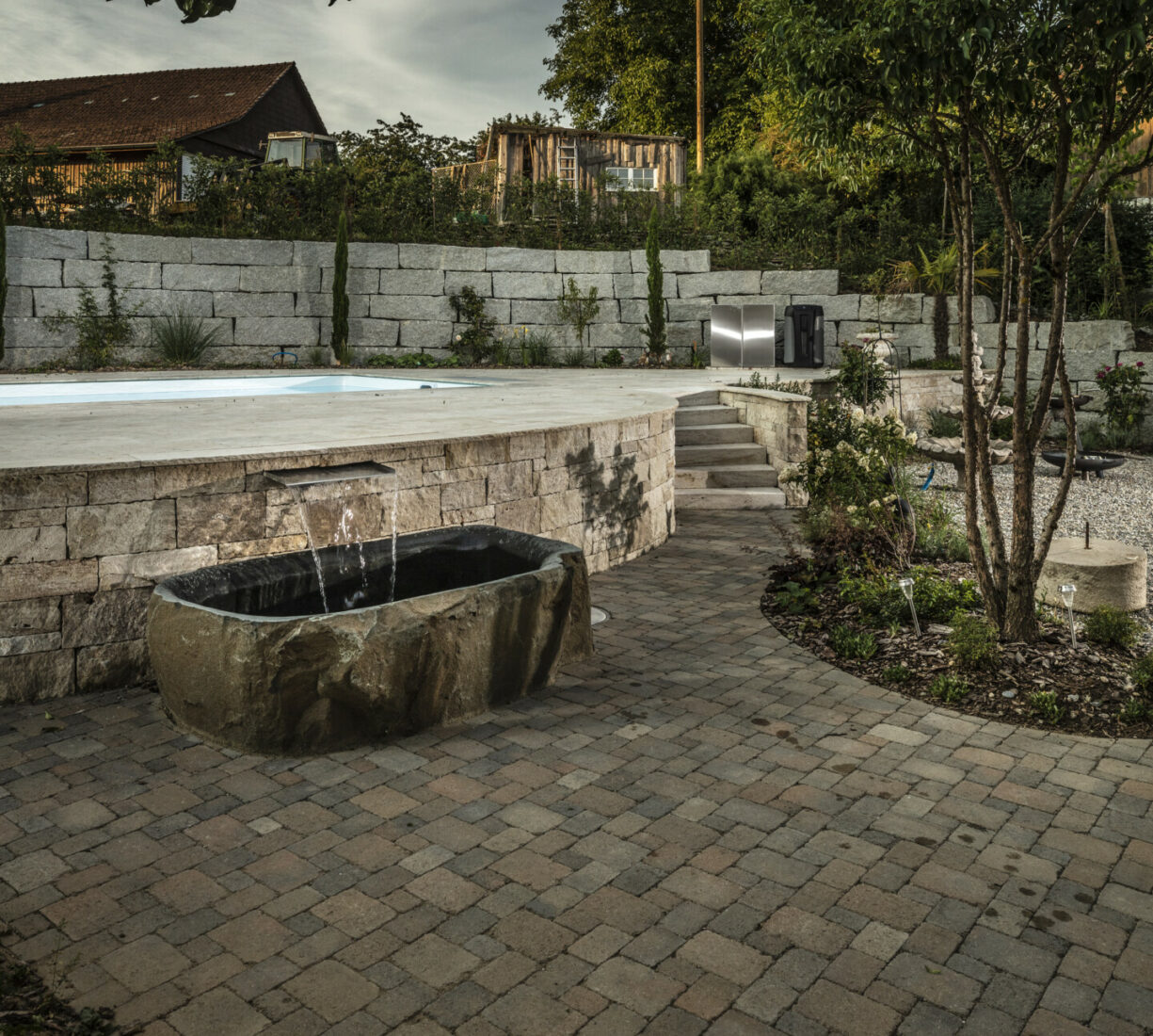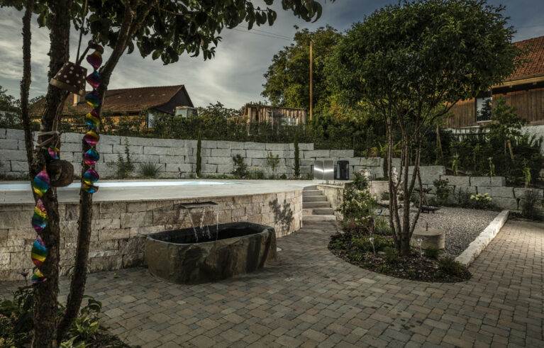 Ein Garten mit einem römischen Touch. Der auf einer erhöhten Ebene stehende Pool lädt zum Baden ein. Die Natursteine aus Travertin verleihen dem Garten einen mediterranen Anstrich. Die Mauern, die das Gelände fangen, sind gegengleich angeordnet. Das schmucke Wasserbecken dient nicht nur zur Zierde, sondern auch als Abkühlbecken der Sauna. Die Solitärbäume und die restliche Bepflanzung verleihen dem Garten das gewisse Etwas.