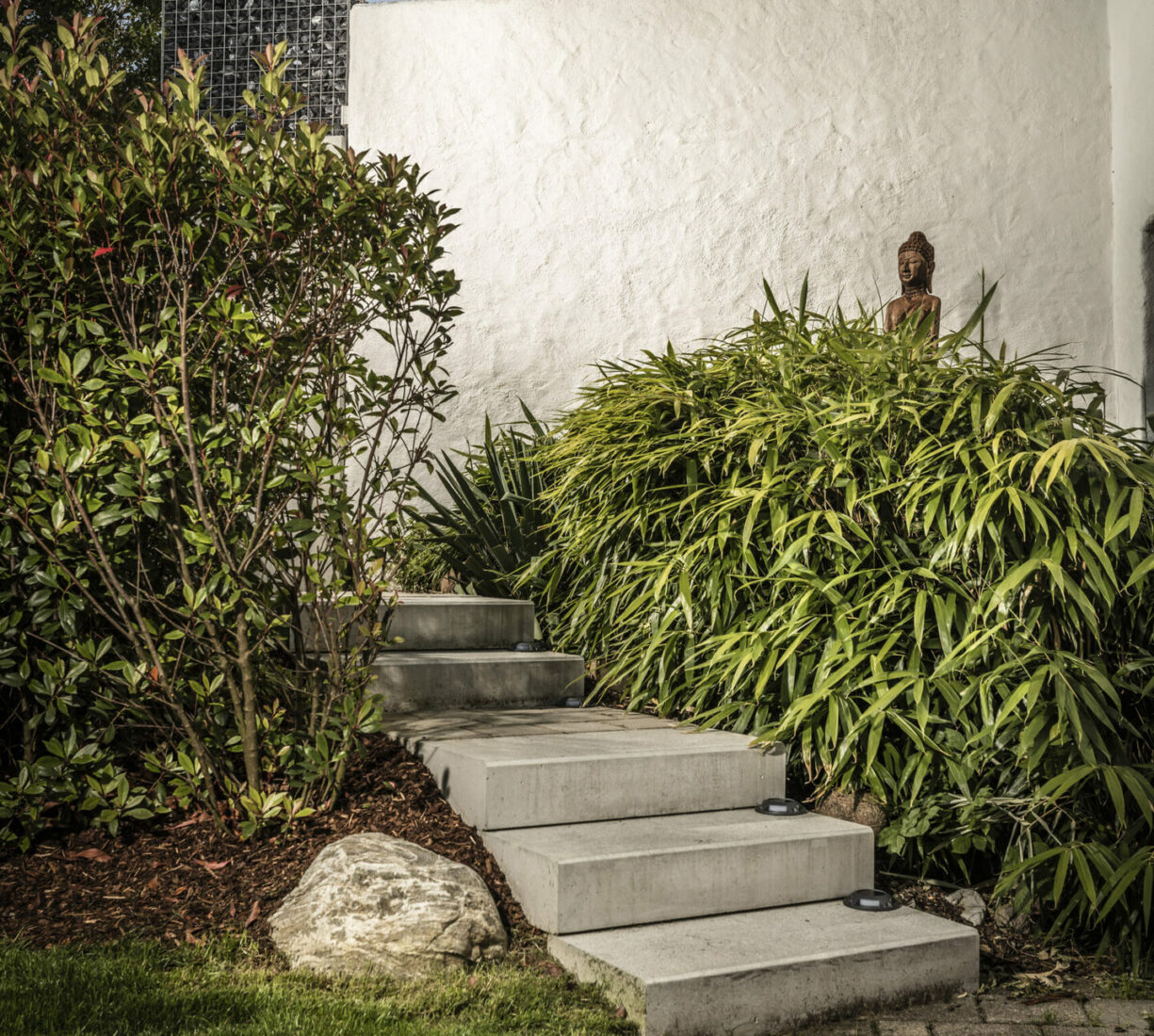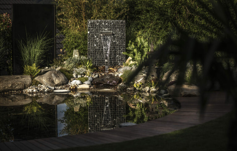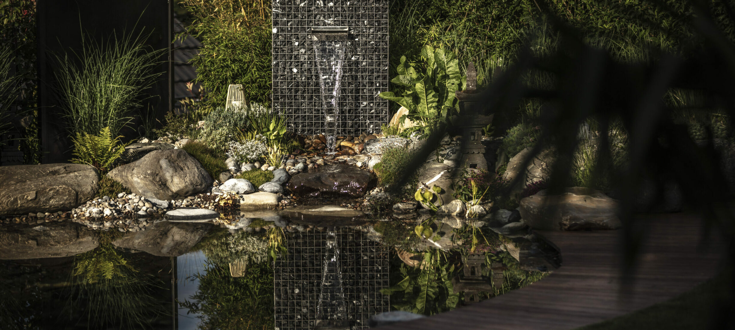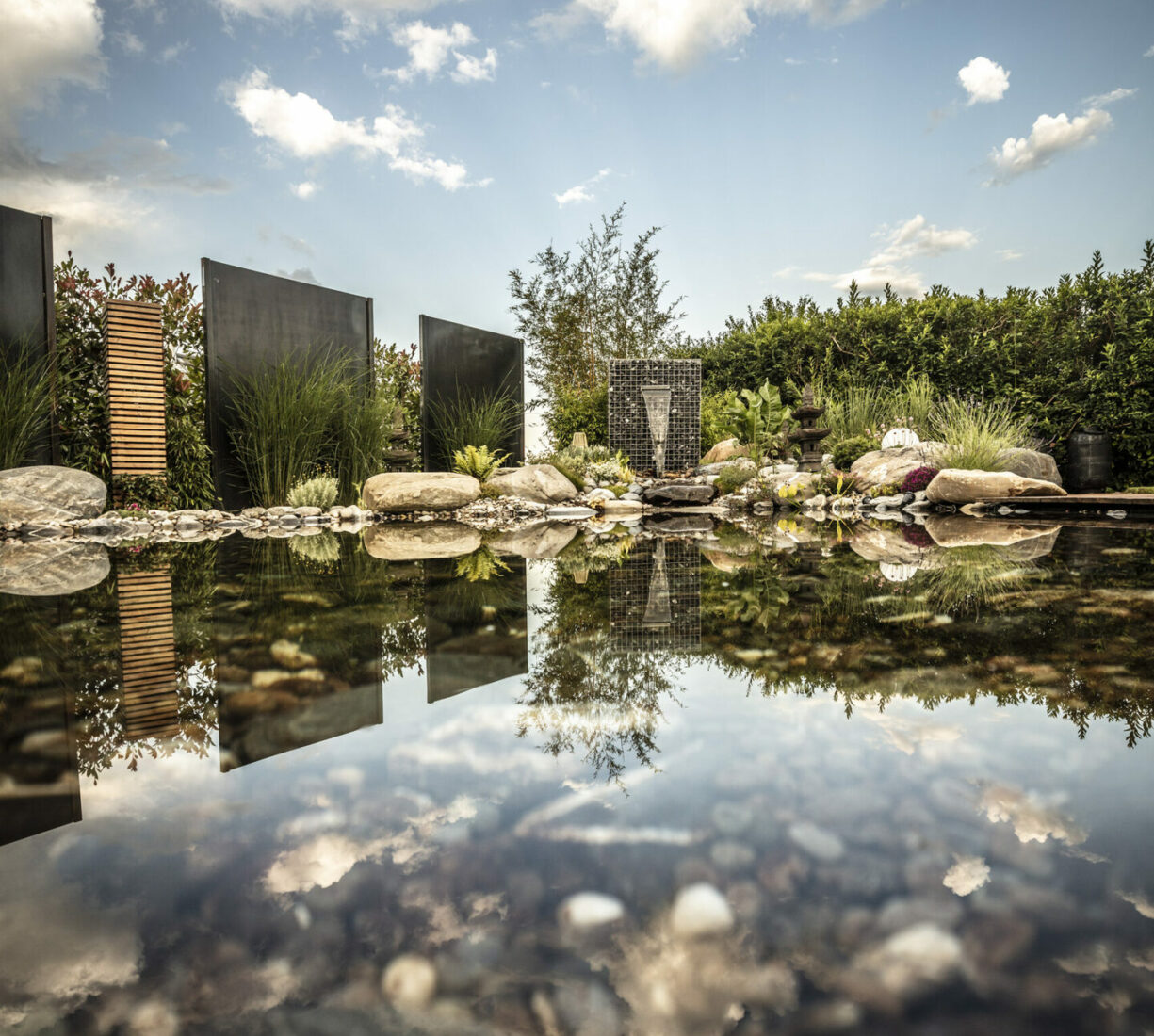 Das Auge geniesst mit. Der Garten wurde stimmungsvoll, modern und stylisch in Szene gesetzt. Der Teich ist nicht nur schön anzusehen, das Plätschern des Wasserfalles vermittelt Ruhe und Geborgenheit. Perfekt, um im Whirlpool zu relaxen.