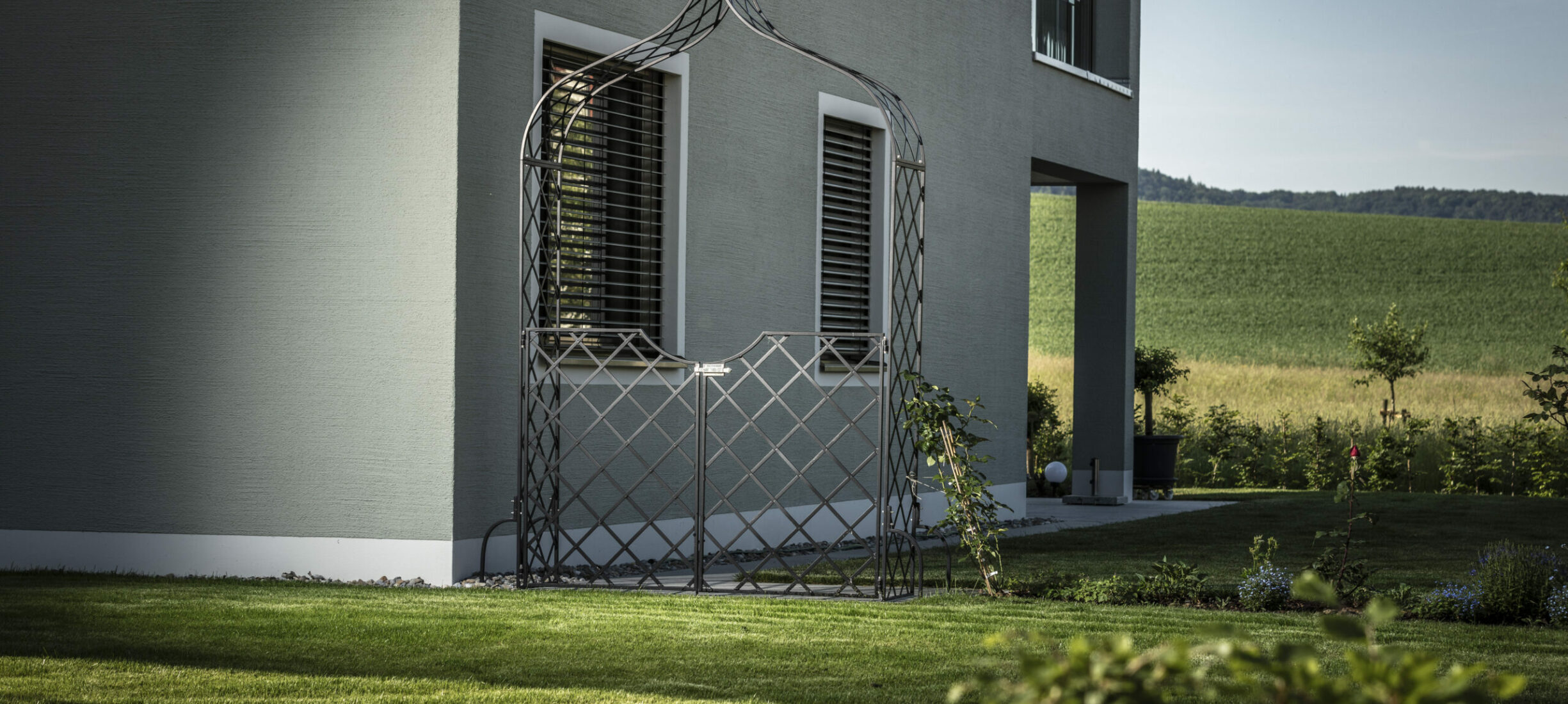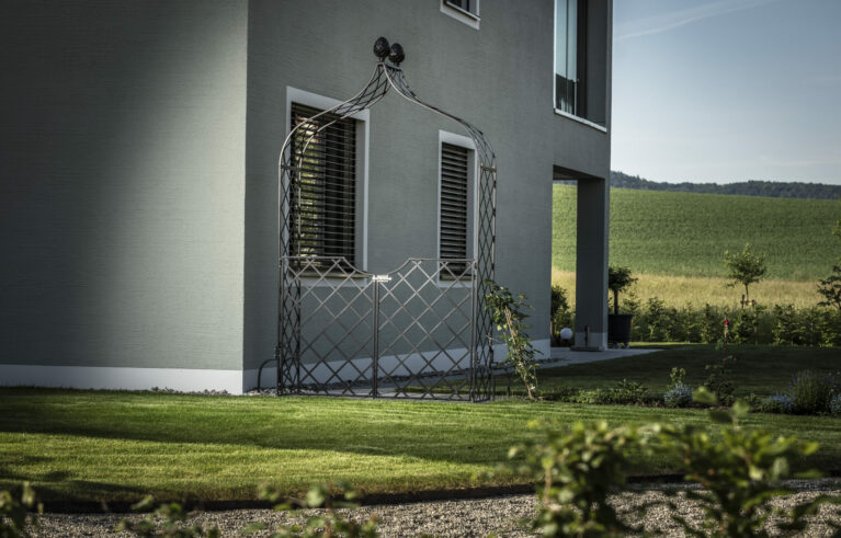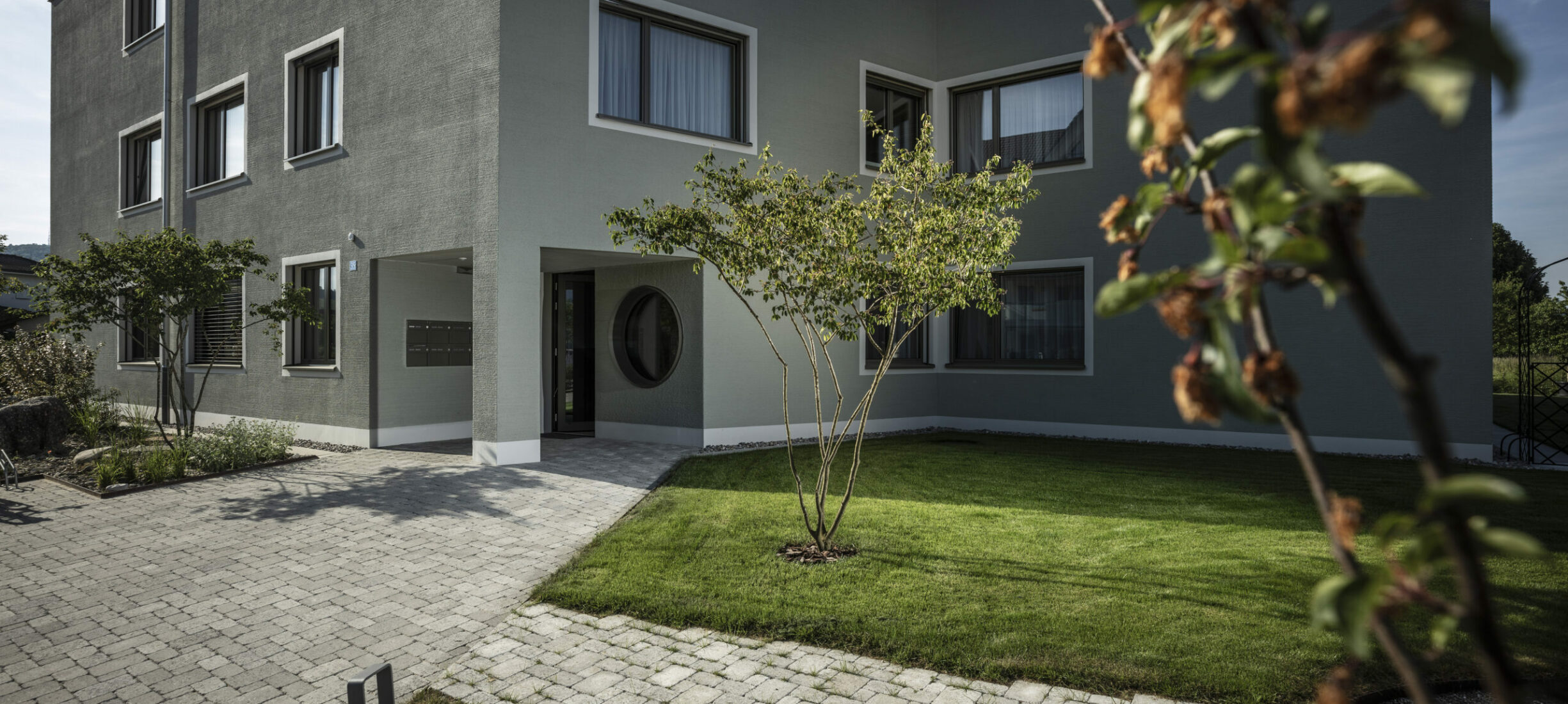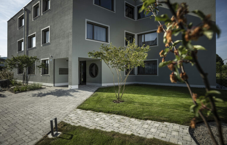Ein modernes Mehrfamilienhaus eingefügt in eine ländliche Umgebung. Eine praktische und pflegeleichte Gartenanlage, welche die optischen Aspekte trotzdem nicht vernachlässigt.