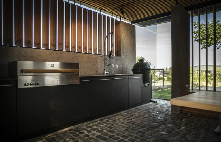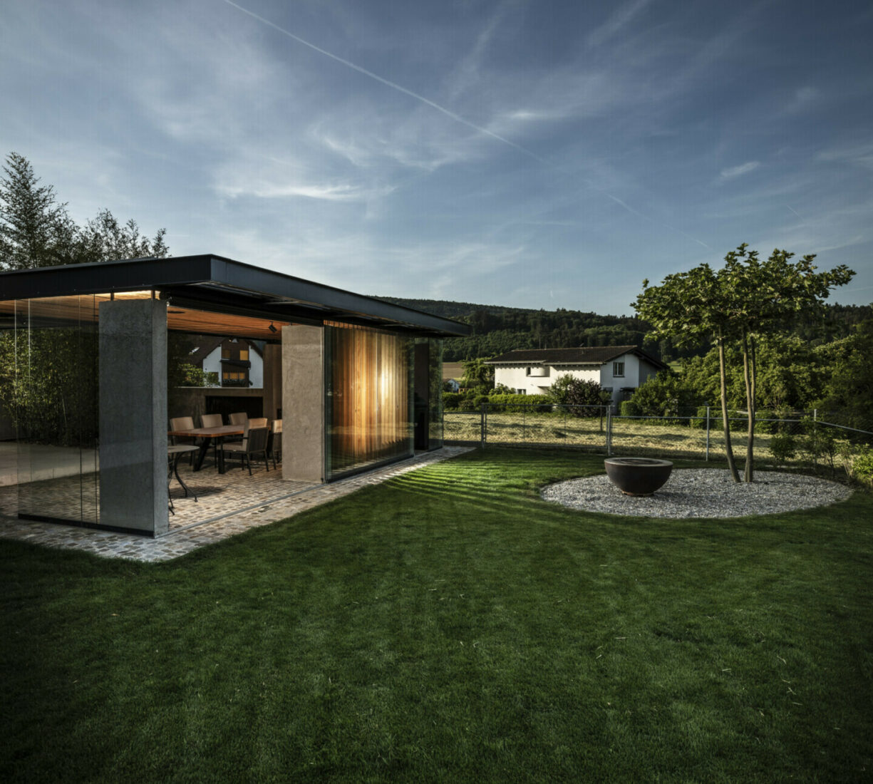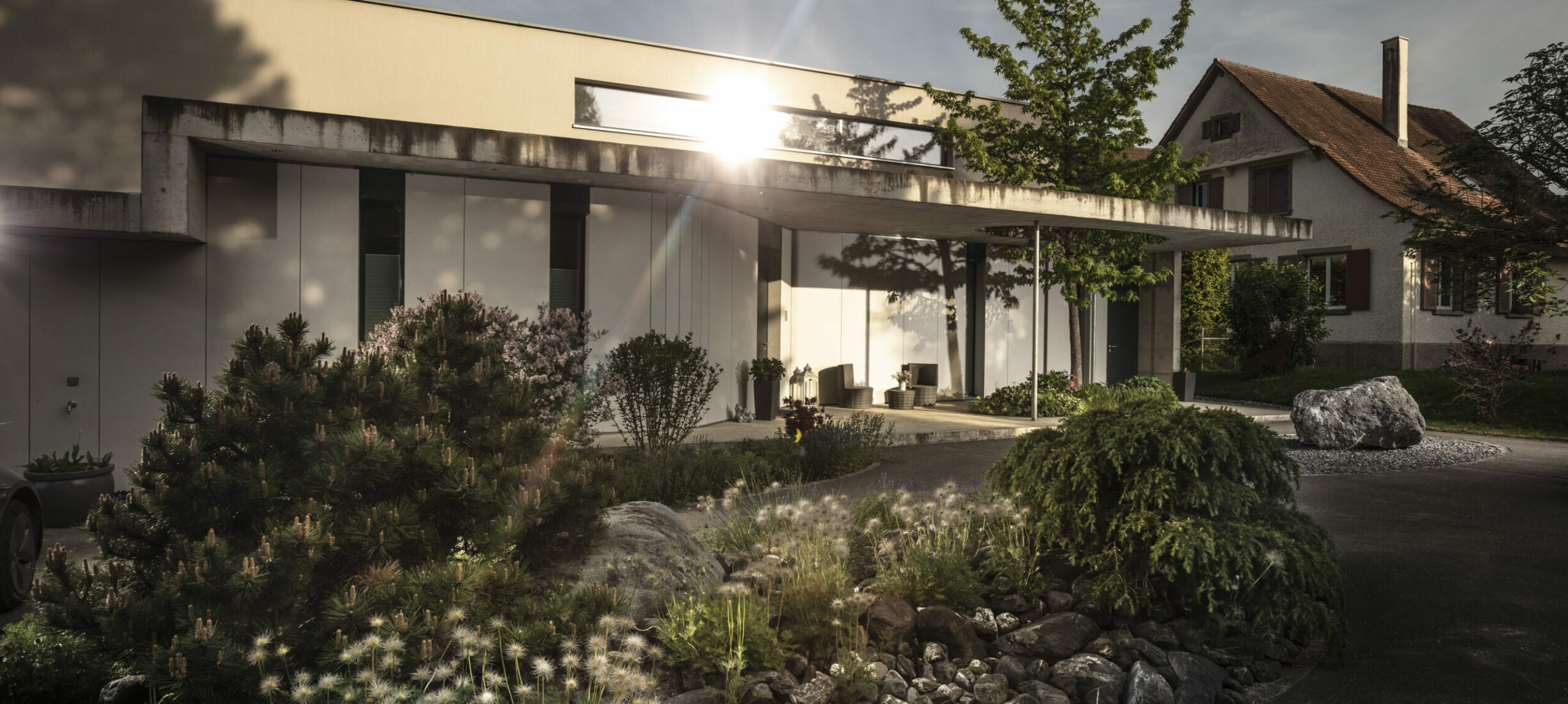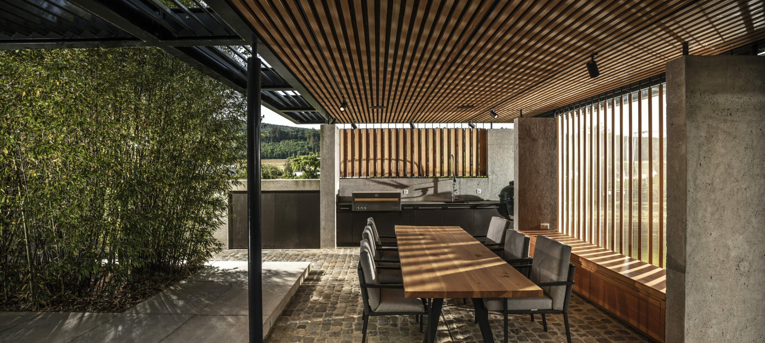 Ob Kochen, Arbeiten im Freien oder sich auf der grossen Rasenflächen austoben: Dieser Garten ist vielseitig nutzbar. Hier trifft Moderne auf Antike. Denn die moderne Gartenlounge steht auf antikem Kopfsteinpflaster.