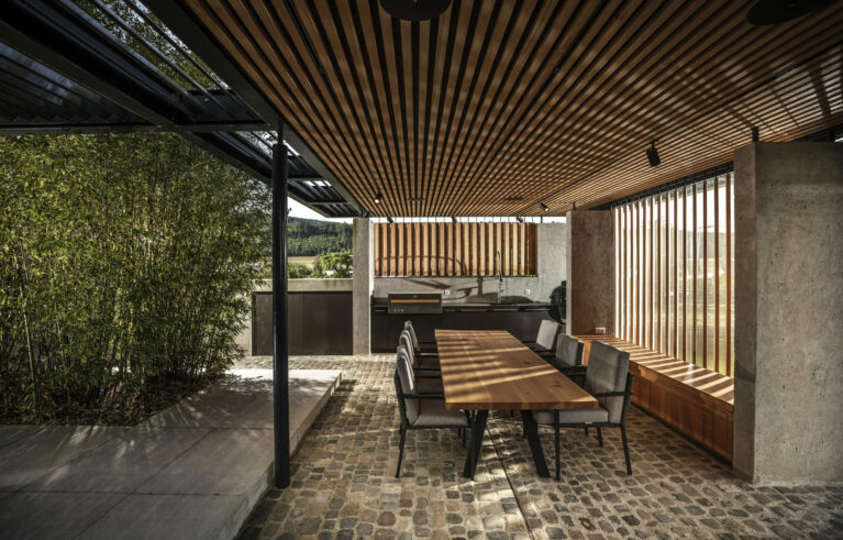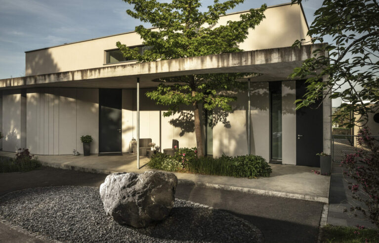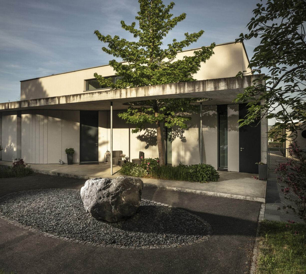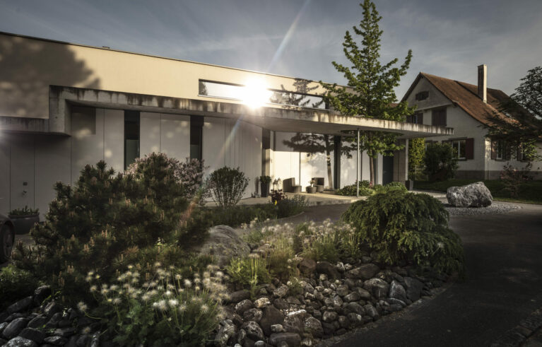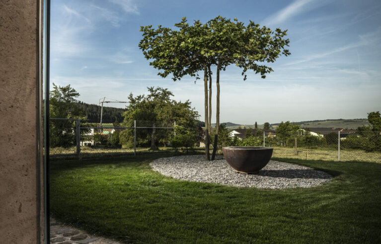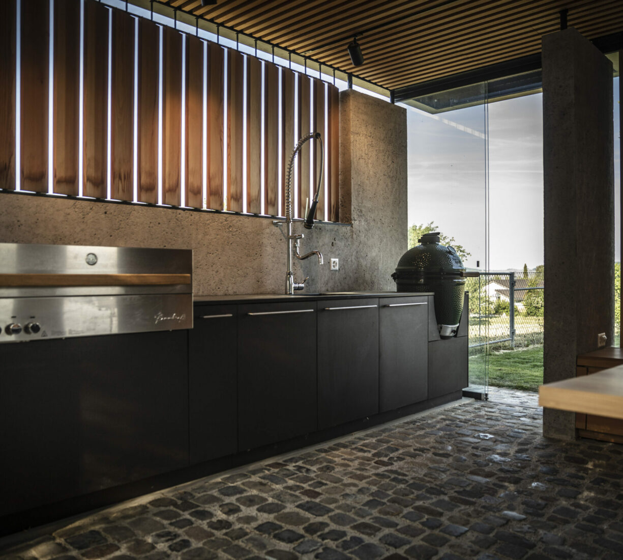 Ob Kochen, Arbeiten im Freien oder sich auf der grossen Rasenflächen austoben: Dieser Garten ist vielseitig nutzbar. Hier trifft Moderne auf Antike. Denn die moderne Gartenlounge steht auf antikem Kopfsteinpflaster.