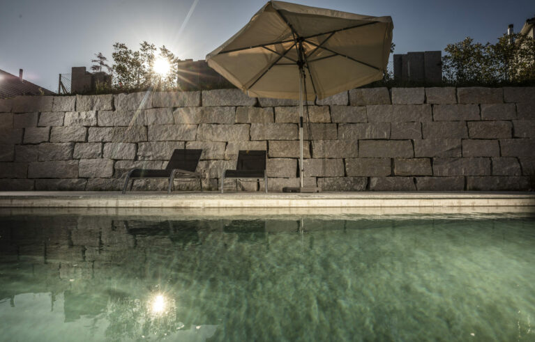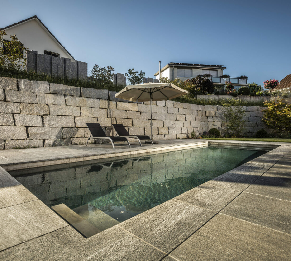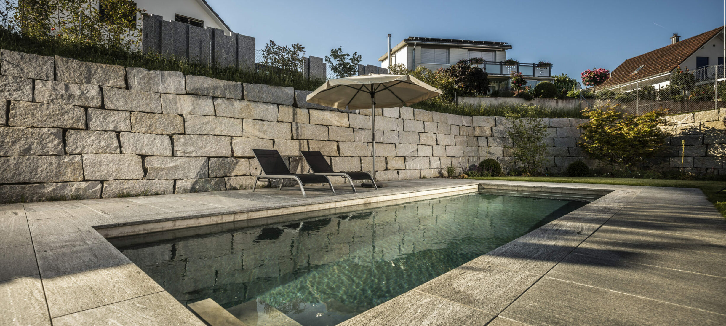 Ein Einfamilienhaus, wie man es sich wünscht. Eine Poolanlage, die zum Baden einlädt, ein grosszügiger und teilweise überdachter Sitzplatz, Blick auf eine stimmungsvolle Bepflanzung und eine grosszügige Rasenfläche.