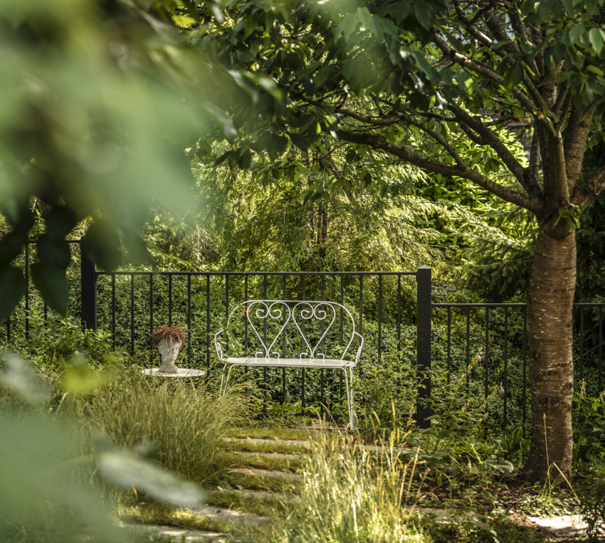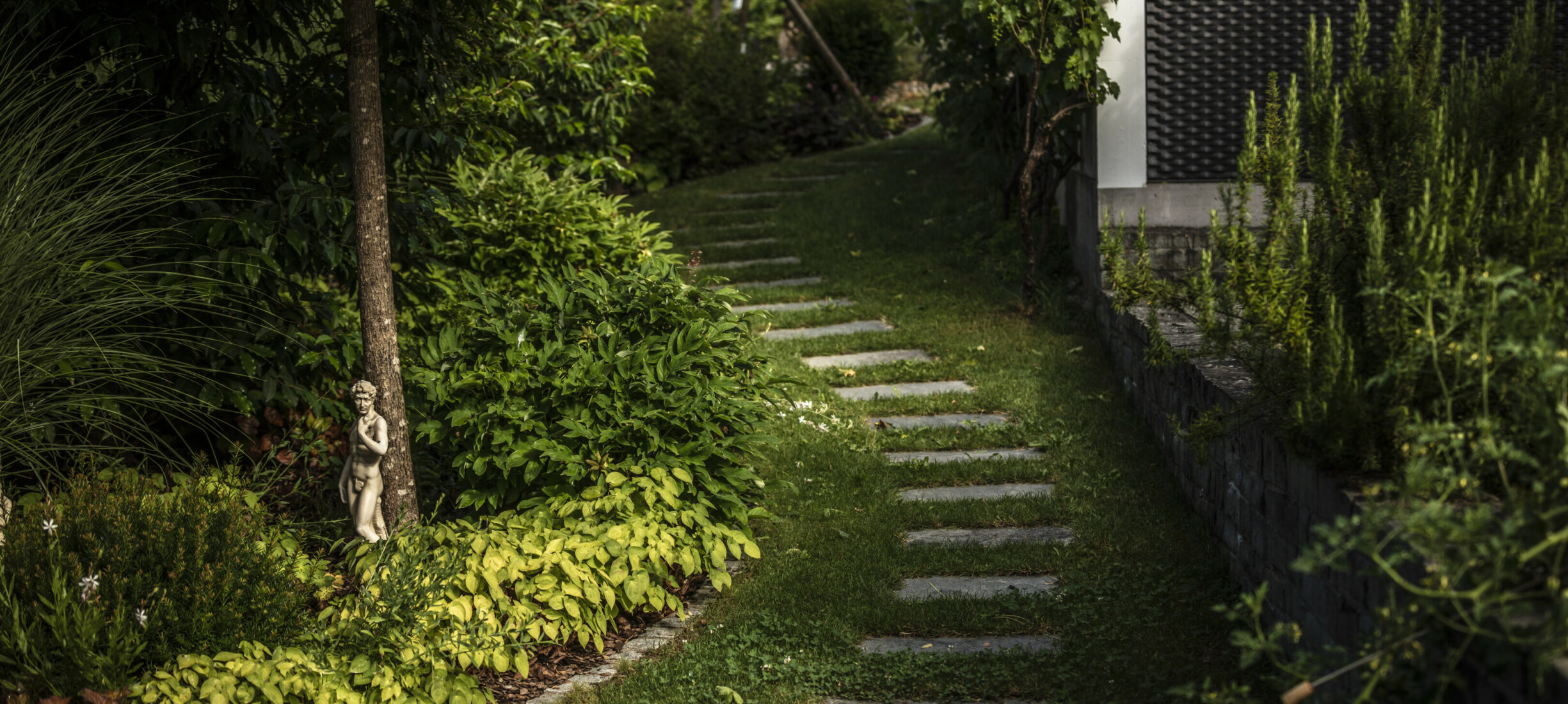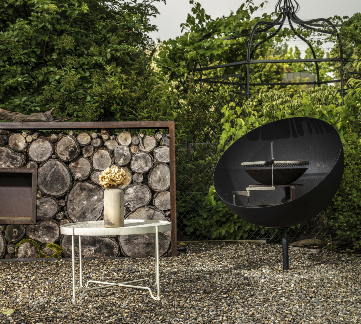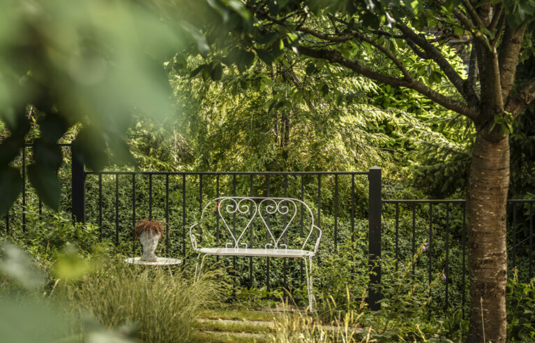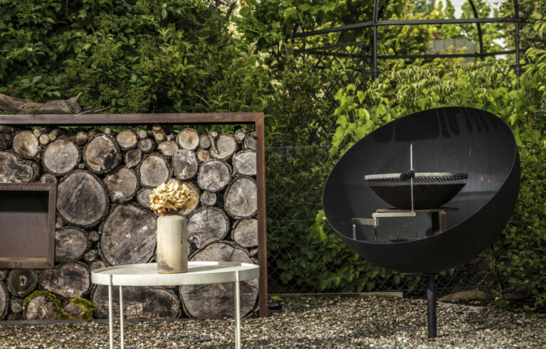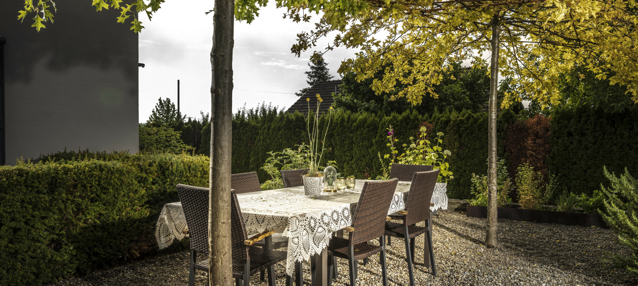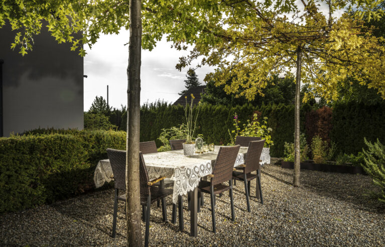 Ein Sitzplatz unter Schirmbäumen sorgt für das ganz besondere Genusserlebnis in diesem Garten. Der kleine Grillplatz mit einer Ablagefläche wird von einer Sichtschutzwand aus Rundholz und Eisen umgeben. Der Zugang in den Garten erfolgt über geschwungene Schrittplatten aus Naturstein. Entlang der Grenze sorgt eine üppig bepflanzte Rabatte für die nötige Privatsphäre.