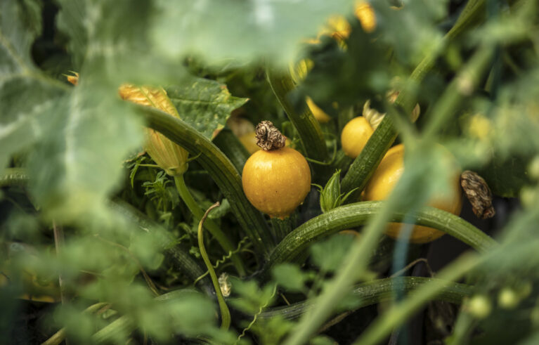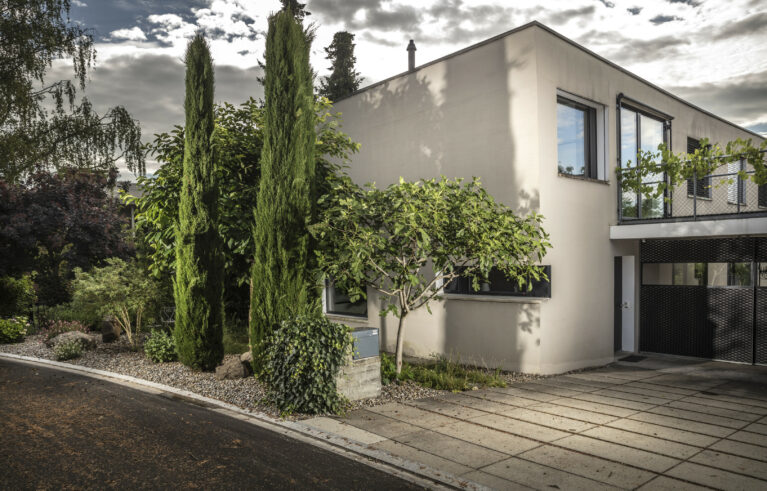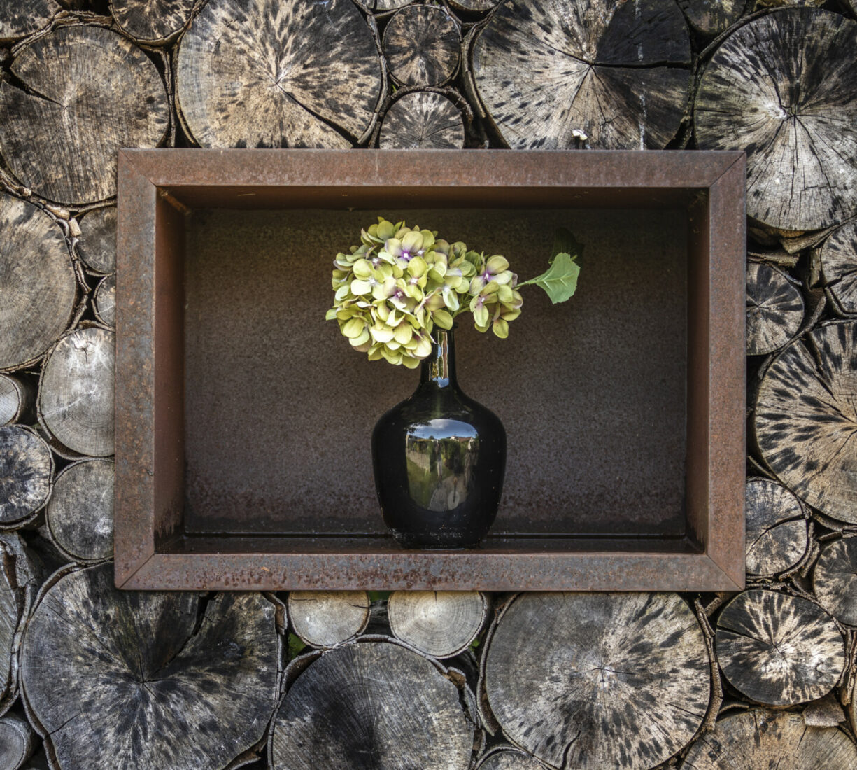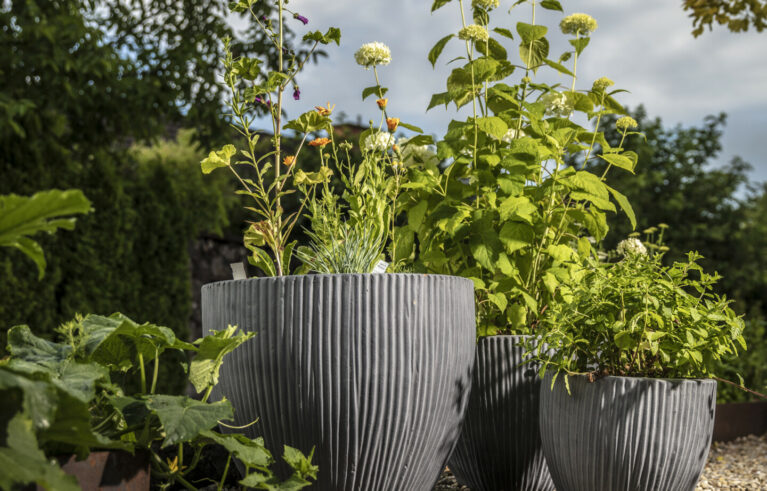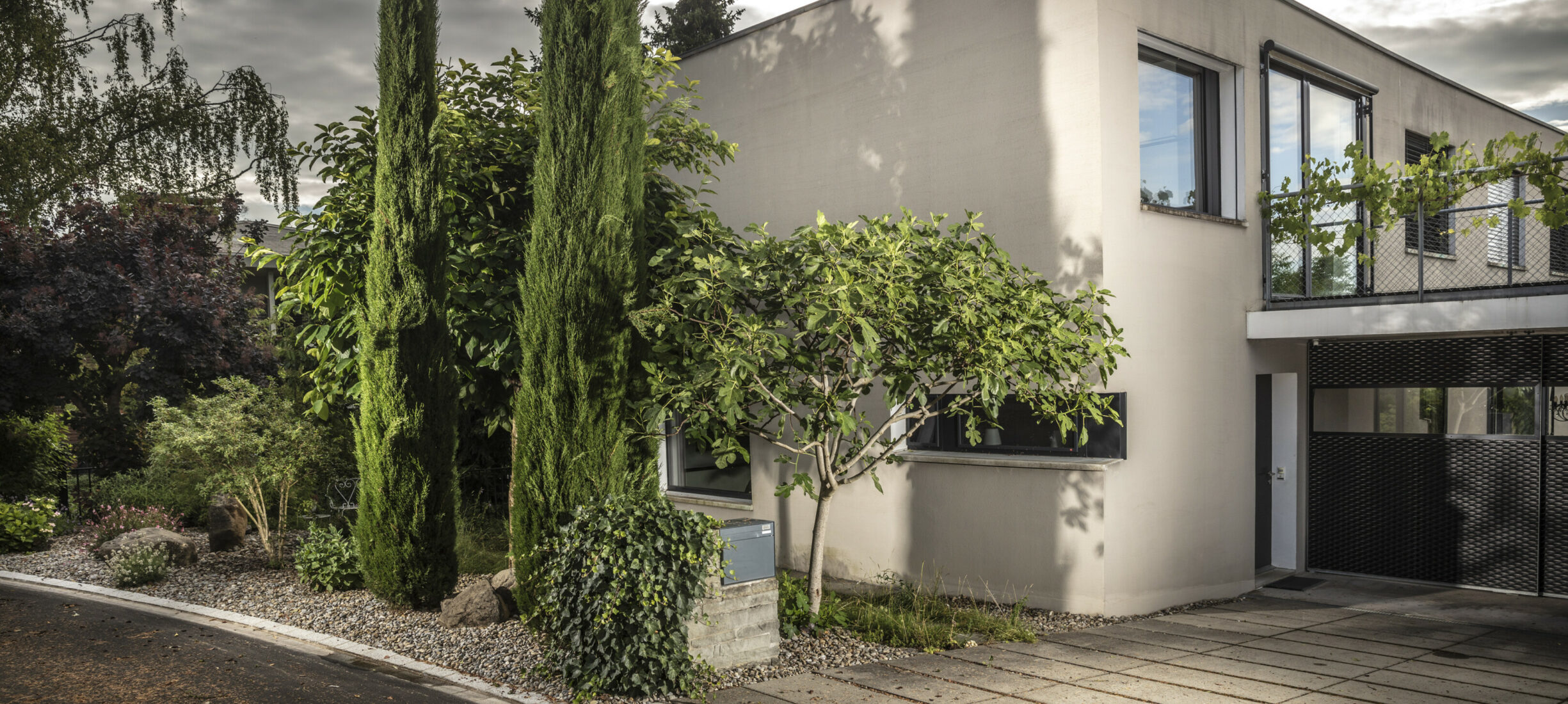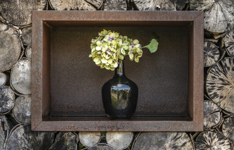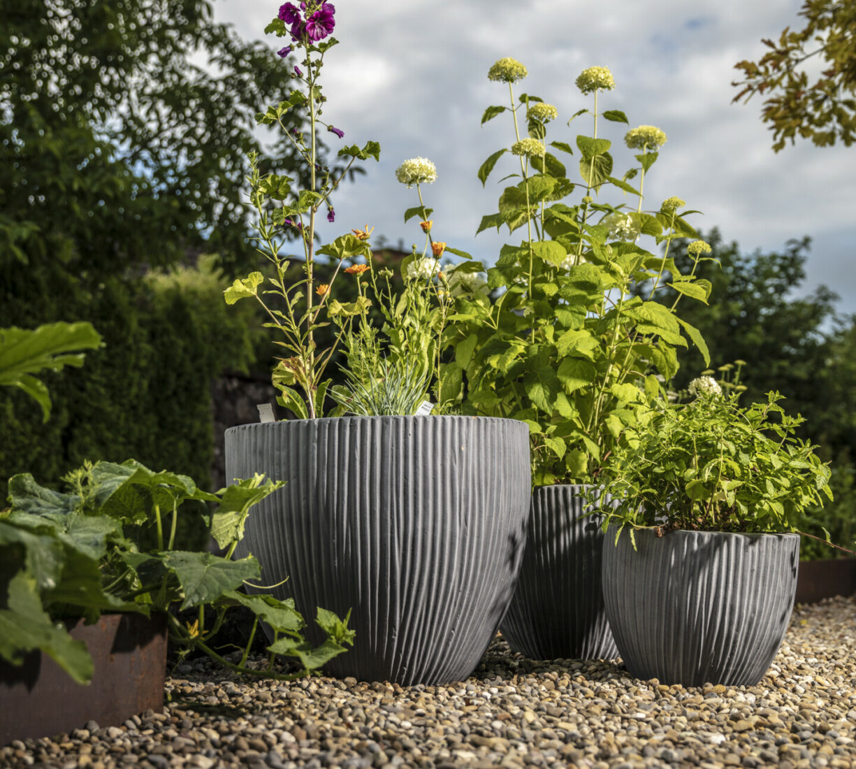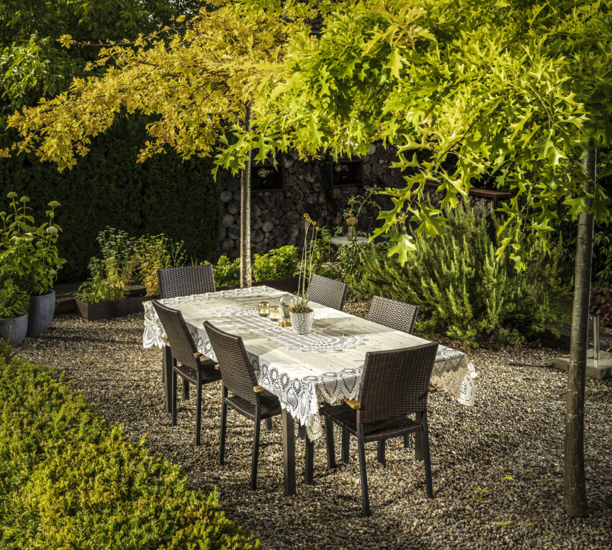 Ein Sitzplatz unter Schirmbäumen sorgt für das ganz besondere Genusserlebnis in diesem Garten. Der kleine Grillplatz mit einer Ablagefläche wird von einer Sichtschutzwand aus Rundholz und Eisen umgeben. Der Zugang in den Garten erfolgt über geschwungene Schrittplatten aus Naturstein. Entlang der Grenze sorgt eine üppig bepflanzte Rabatte für die nötige Privatsphäre.