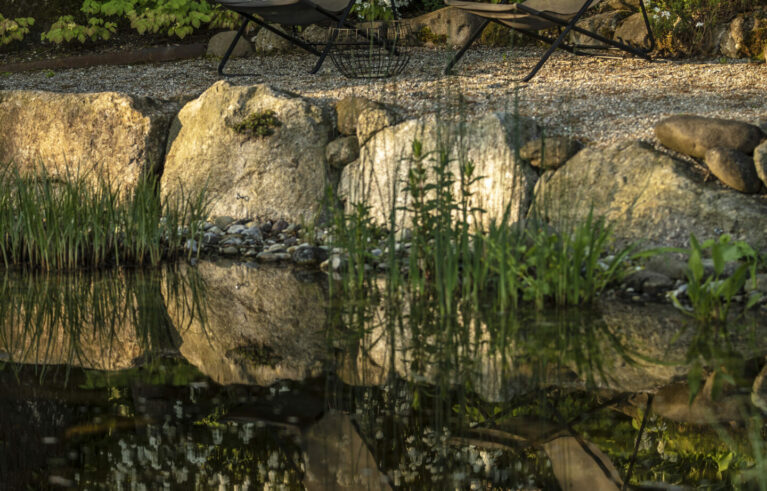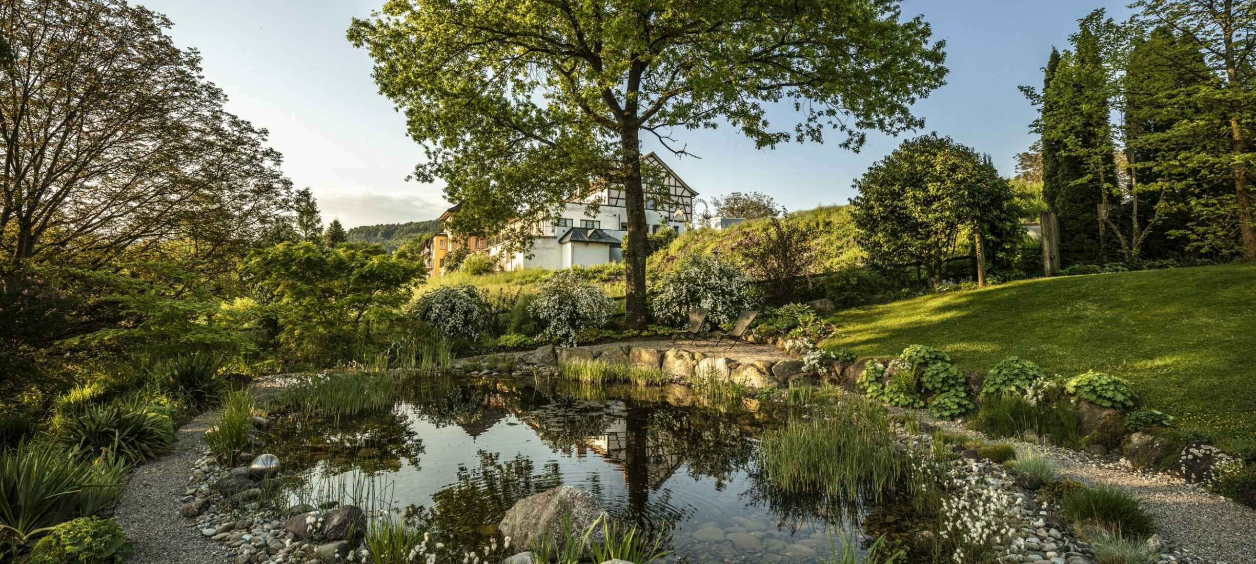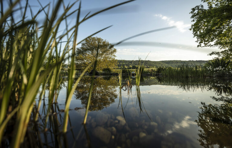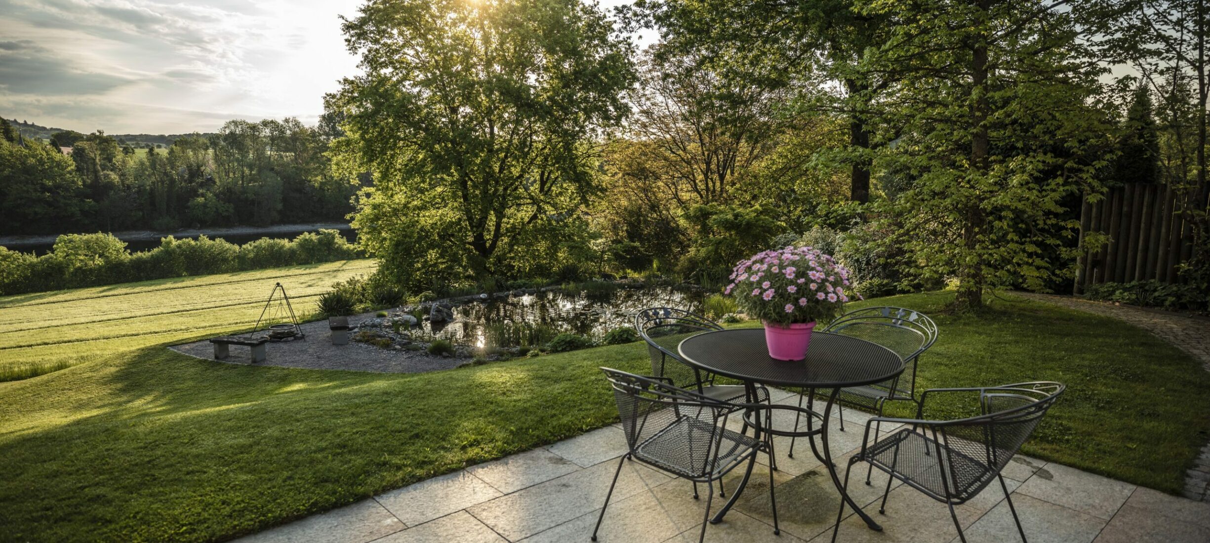 Ein Garten, eingebettet in eine wunderschöne Umgebung, ein Teich, der vor sich hinplätschert, und viele lauschige Ecken zum Verweilen und Grillieren. Vom Sitzplatz aus sieht man direkt auf den wunderschönen Rhein. Dazu kommt ein von blühenden Stauden umgebener Gemüsegarten mit frischen Salaten.