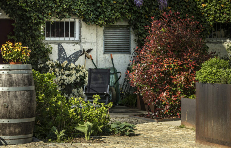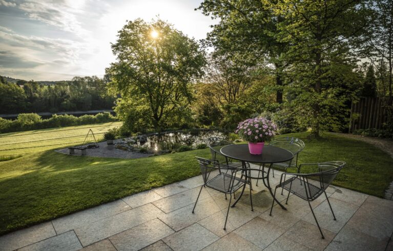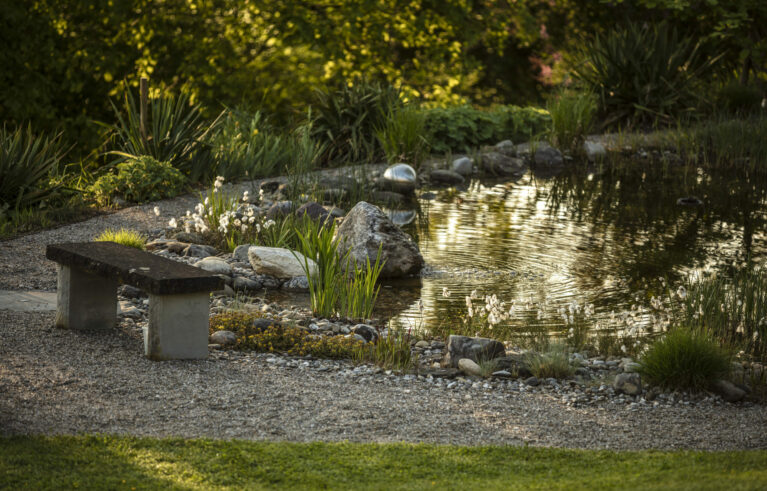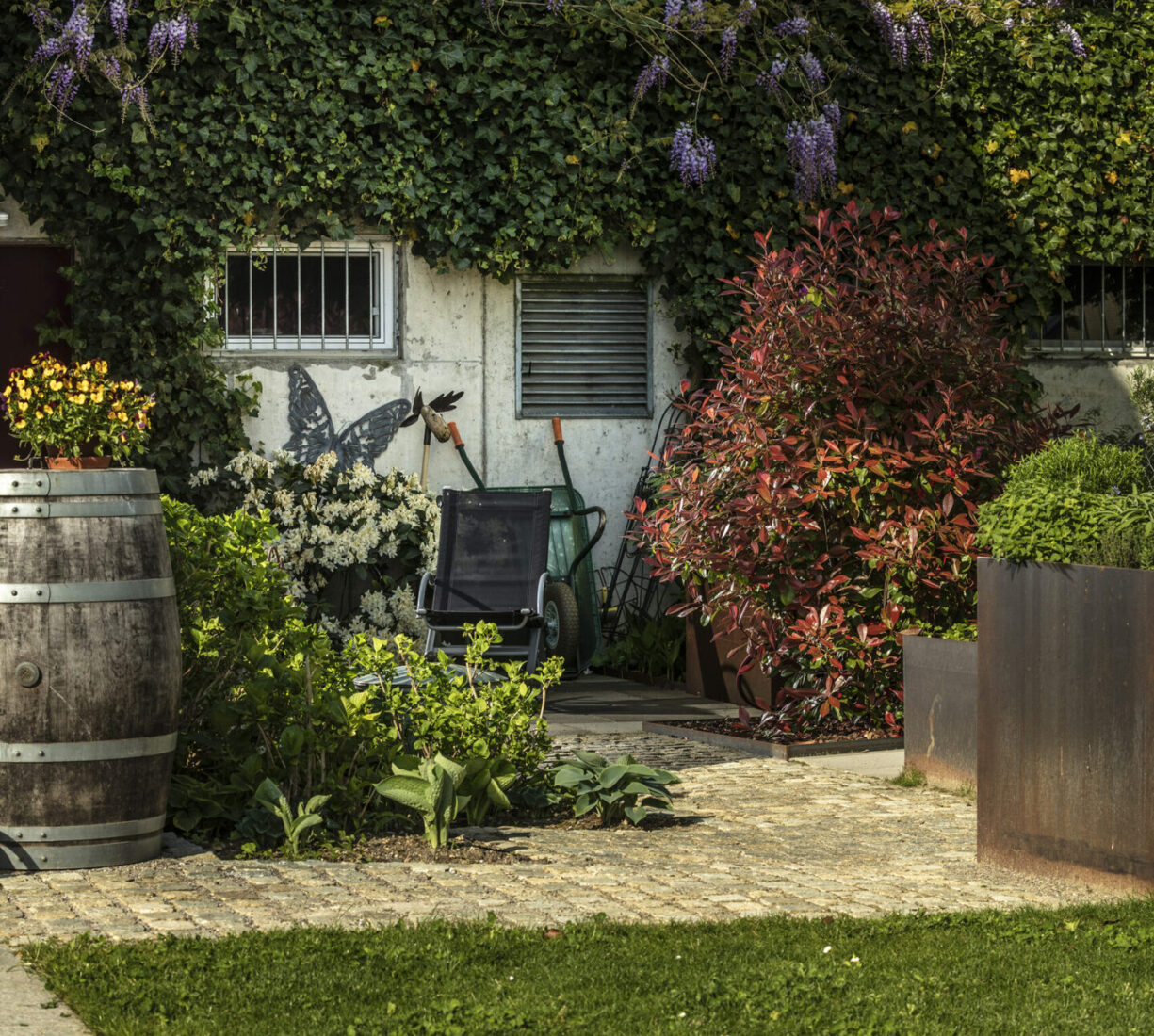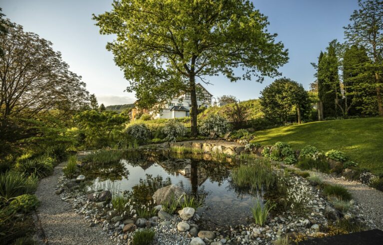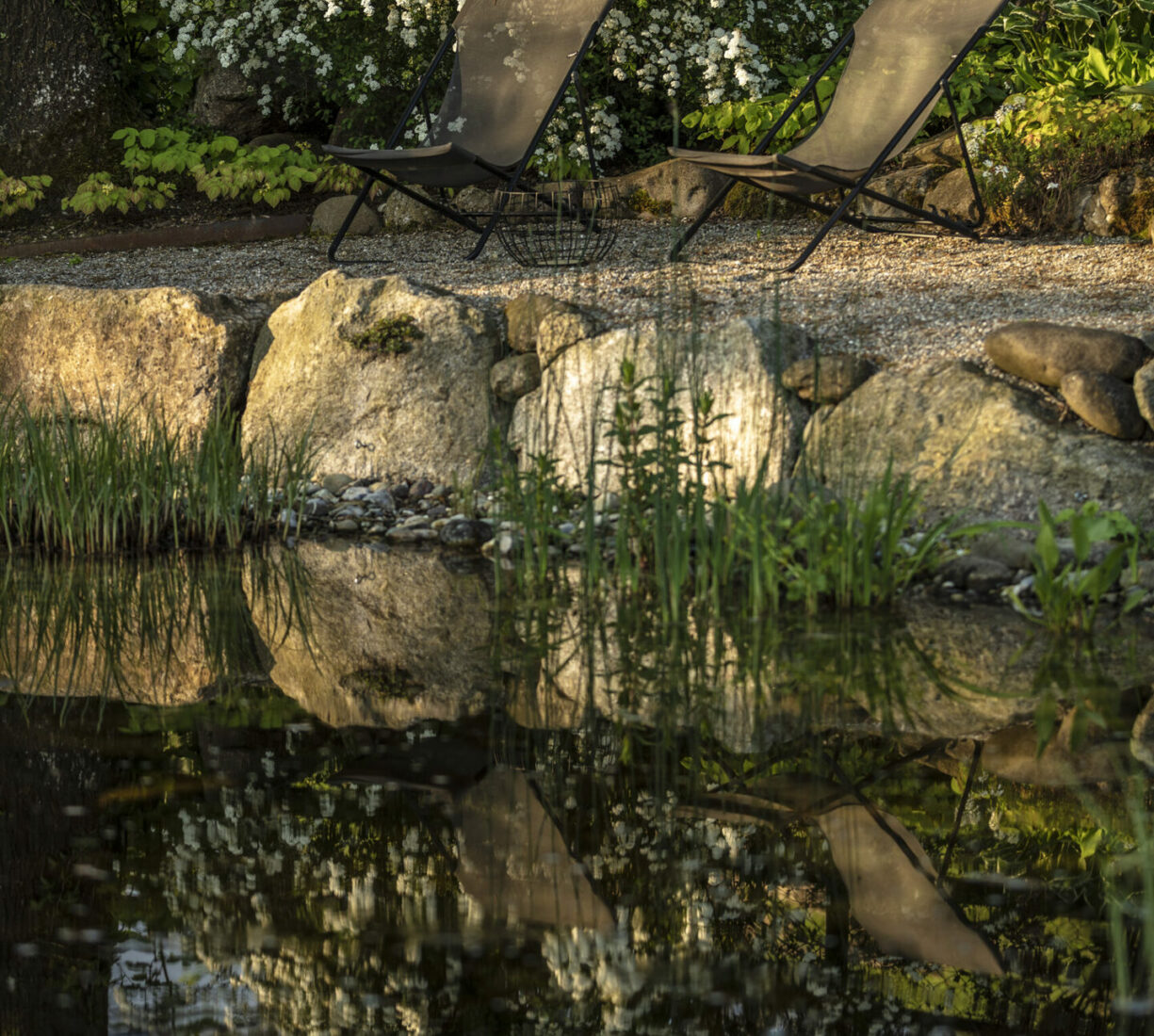 Ein Garten, eingebettet in eine wunderschöne Umgebung, ein Teich, der vor sich hinplätschert, und viele lauschige Ecken zum Verweilen und Grillieren. Vom Sitzplatz aus sieht man direkt auf den wunderschönen Rhein. Dazu kommt ein von blühenden Stauden umgebener Gemüsegarten mit frischen Salaten.