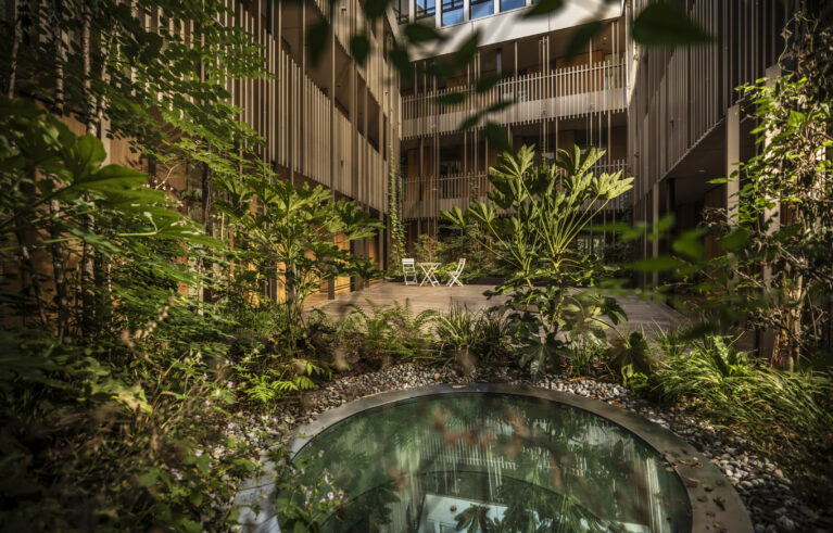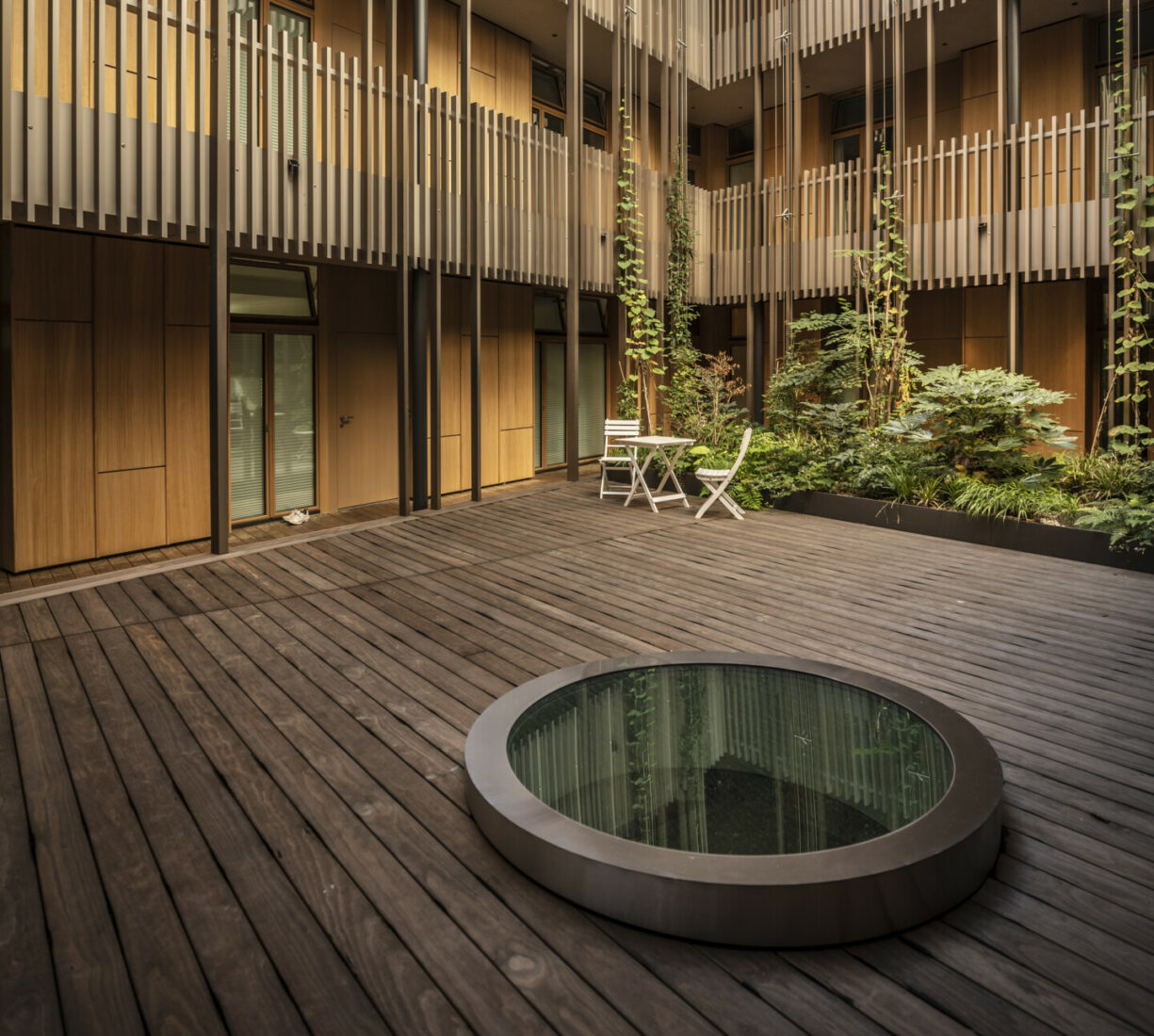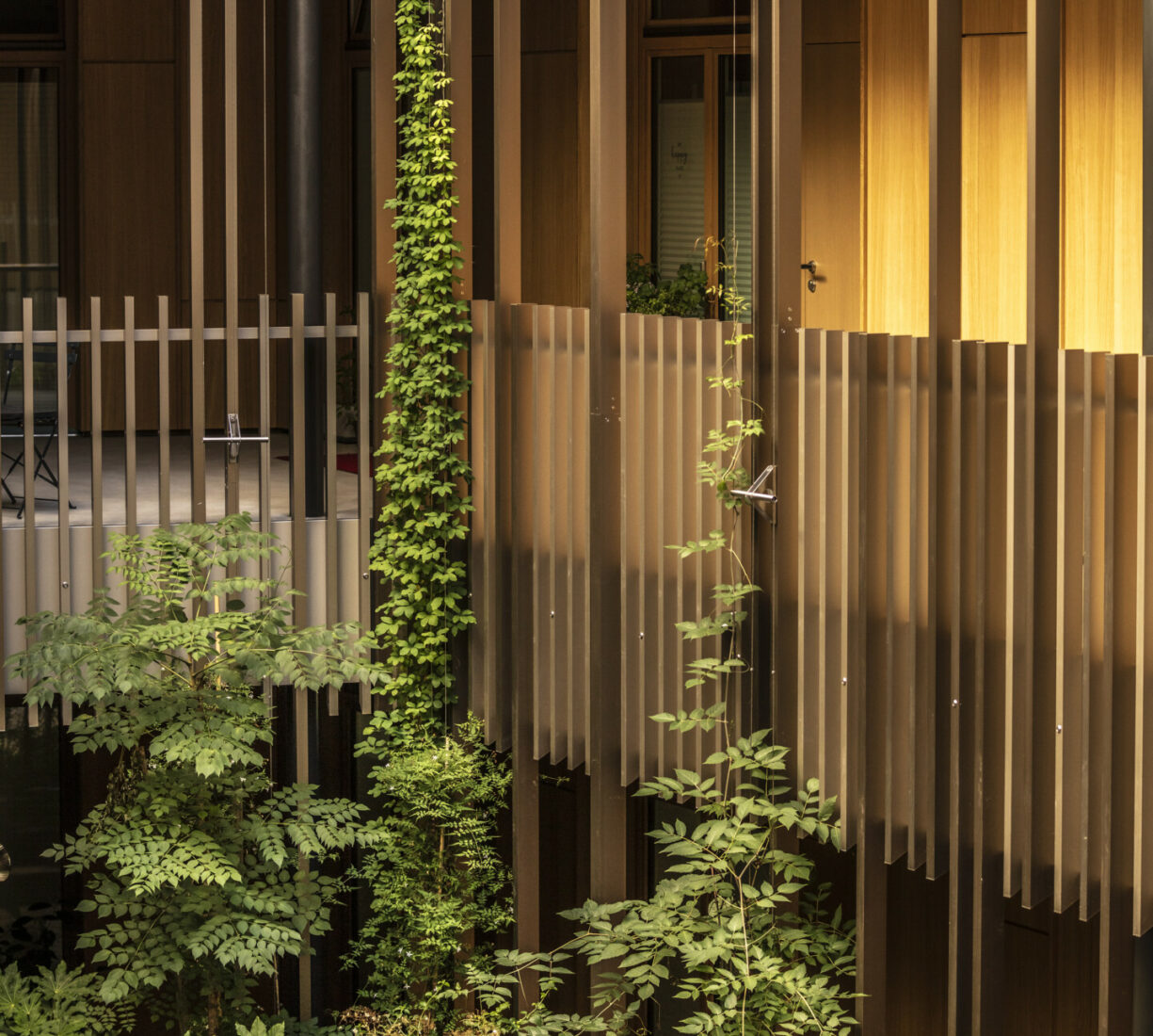 Der grüne Innenhof dient als Eingangsbereich sämtlicher Wohnungen. Die Pflanzrabatten bilden dabei den grünen Eyecatcher. Die Pflanztröge sind mit einer automatischen Bewässerung ausgestattet. Die Kletterpflanzen ranken sich in die Höhe: Wahres Dschungel-feeling mitten in der Stadt!