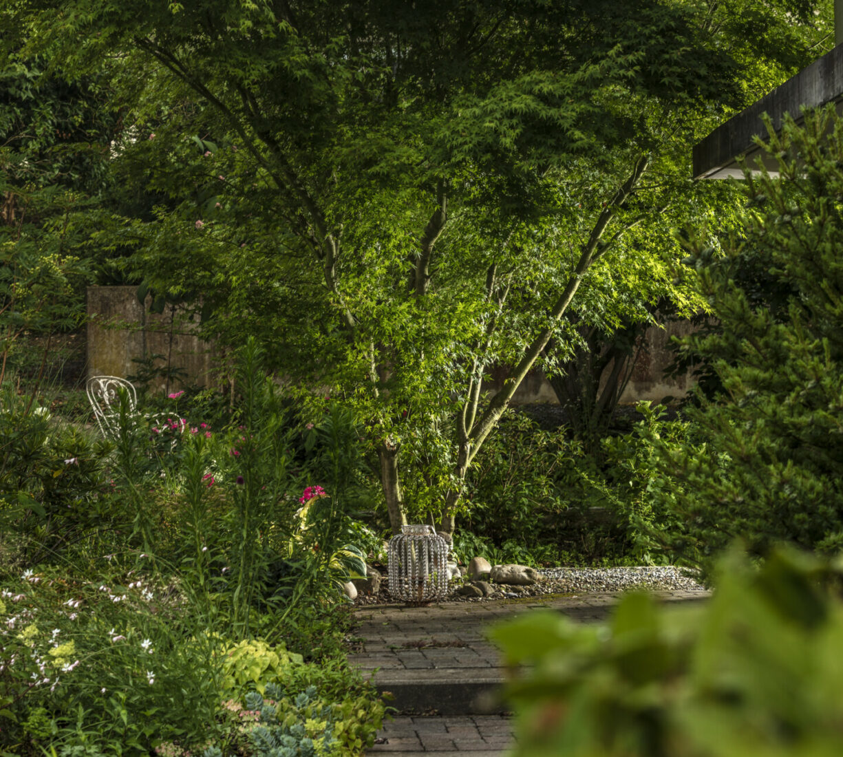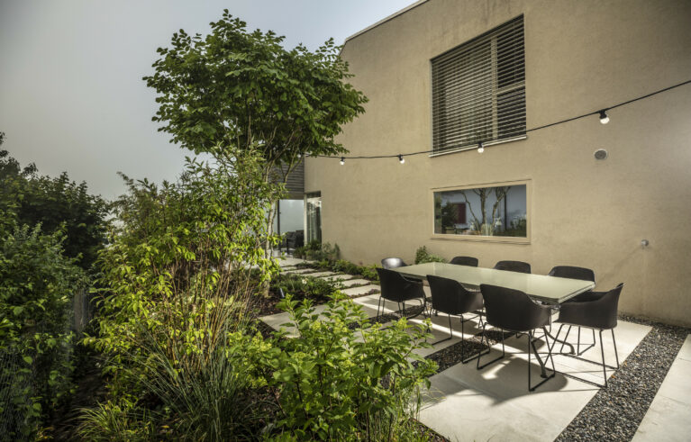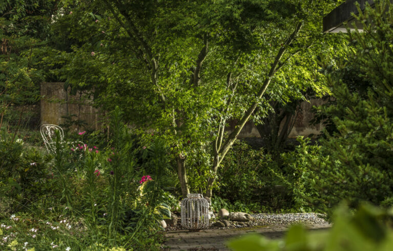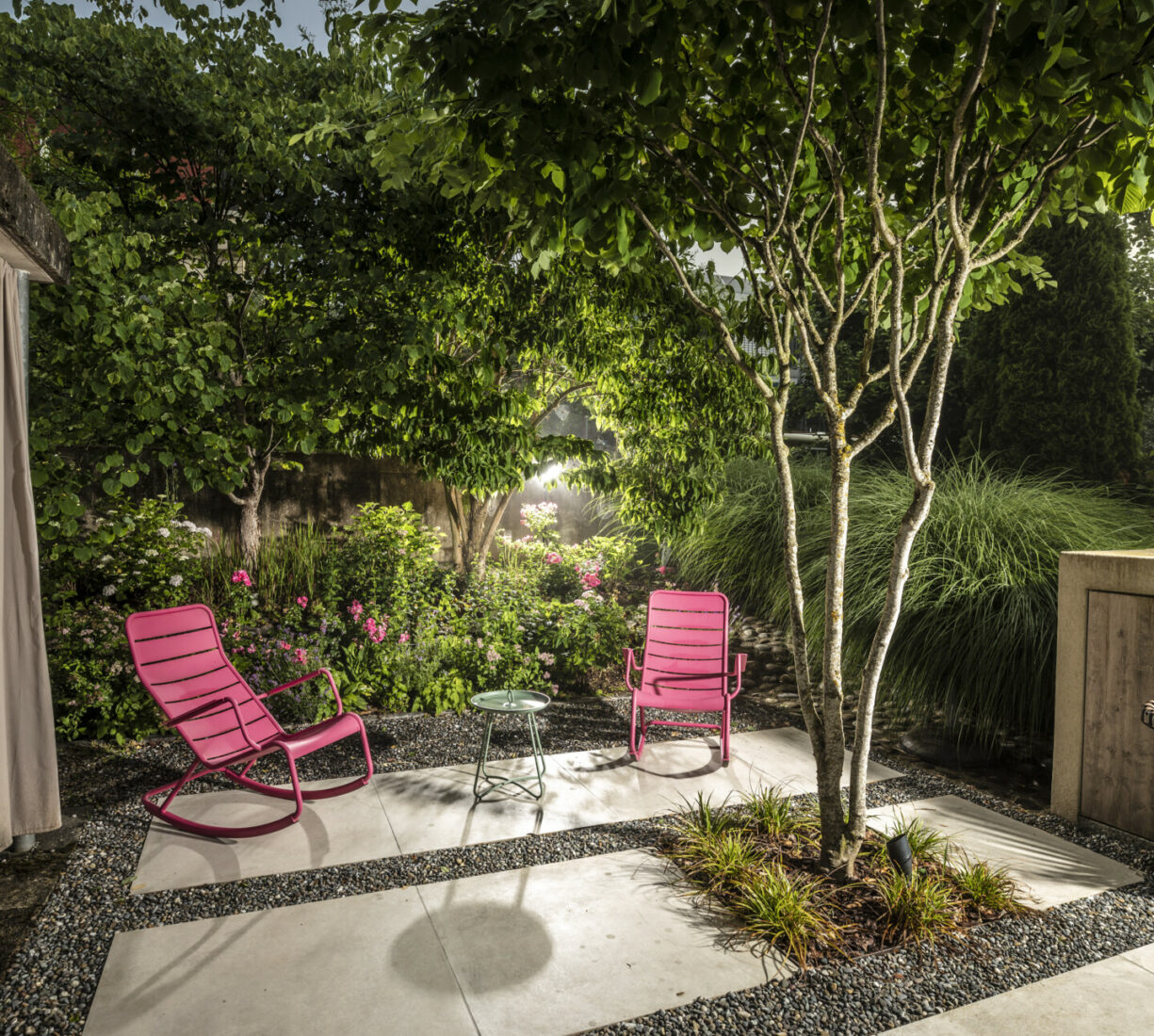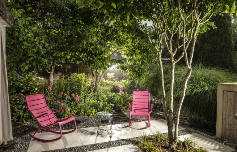 Eine Erweiterung des Sitzplatzbereiches und eine Sanierung der Holzterrasse verleihen dem Garten den modernen Touch. Die gross-formatigen Feinsteinplatten werden durch eine Rundkies-Chaussierung gebrochen und lassen den Sitzplatzbereich leicht wirken. Für das Ambiente sorgen die mehrstämmigen Solitär-Grosssträucher. Die Bepflanzung verwandelt den Garten in einen traumhaften Ort.