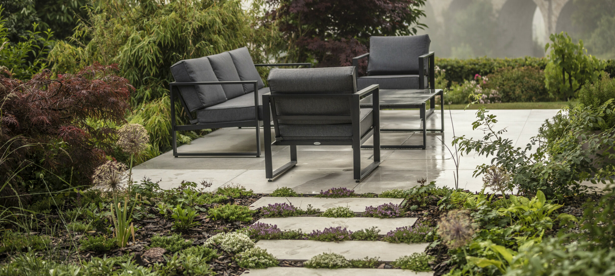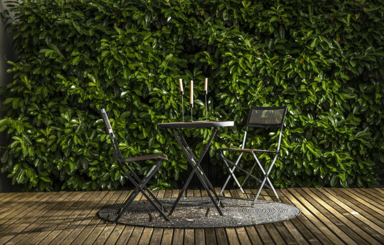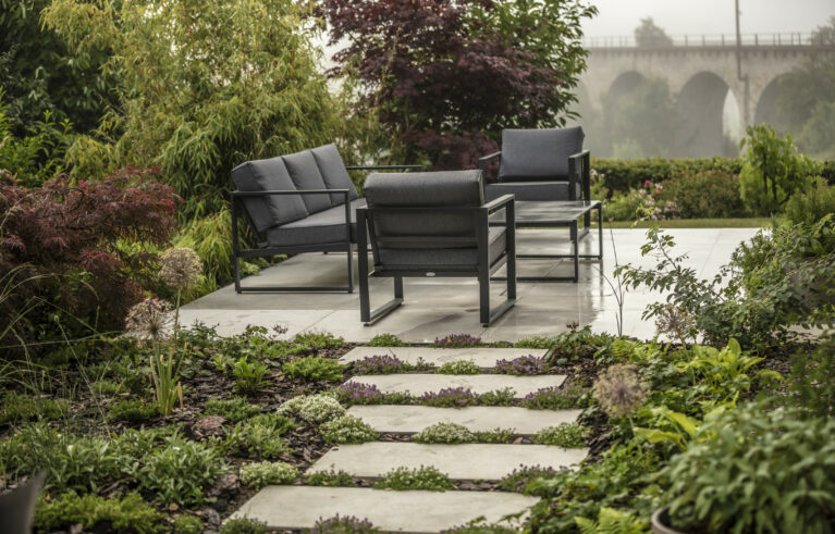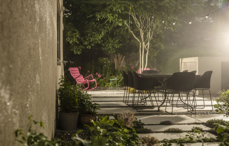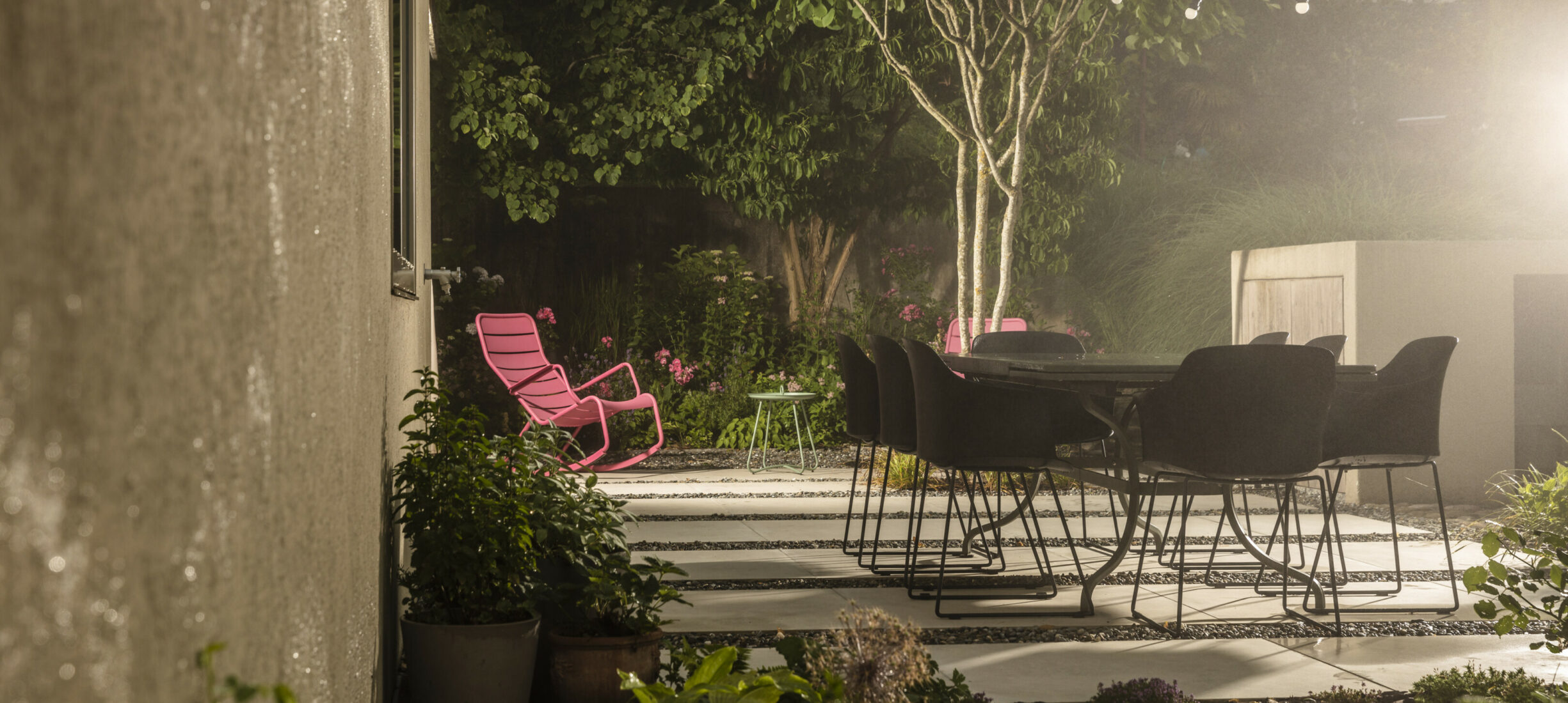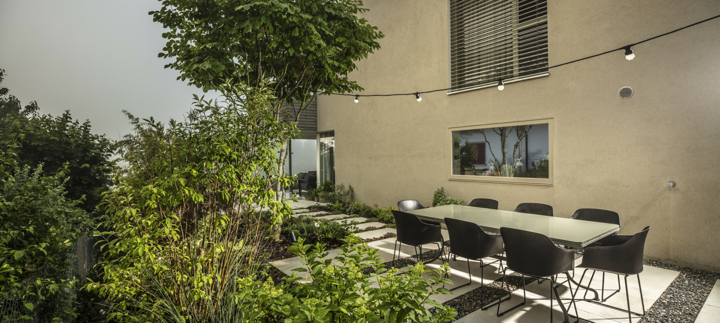 Eine Erweiterung des Sitzplatzbereiches und eine Sanierung der Holzterrasse verleihen dem Garten den modernen Touch. Die gross-formatigen Feinsteinplatten werden durch eine Rundkies-Chaussierung gebrochen und lassen den Sitzplatzbereich leicht wirken. Für das Ambiente sorgen die mehrstämmigen Solitär-Grosssträucher. Die Bepflanzung verwandelt den Garten in einen traumhaften Ort.